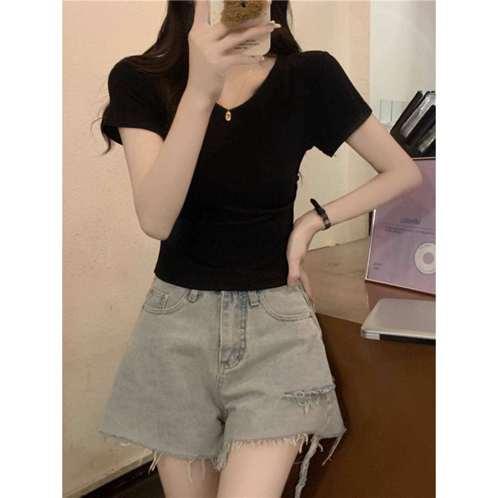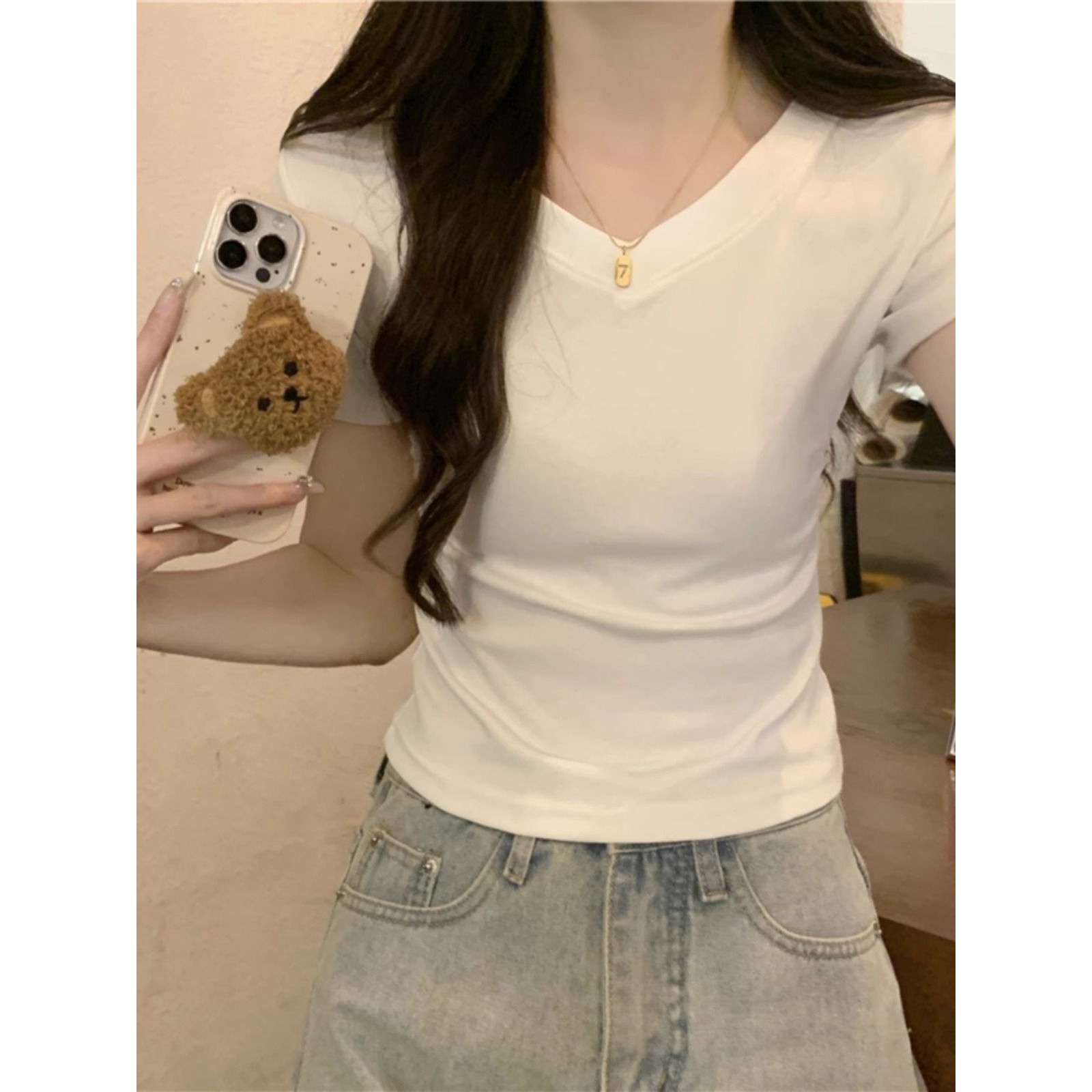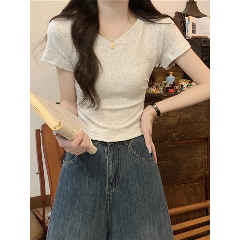 纯棉v领正肩灰色t恤女短袖夏季修身不规则设计感小众掐腰甜辣上衣