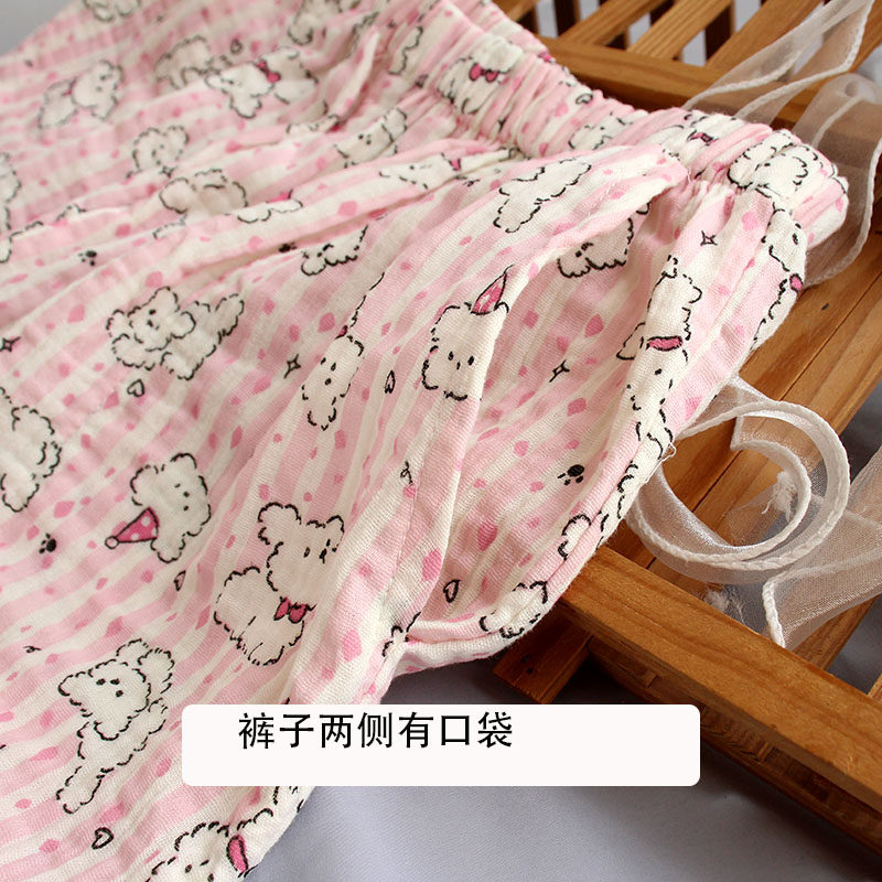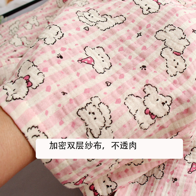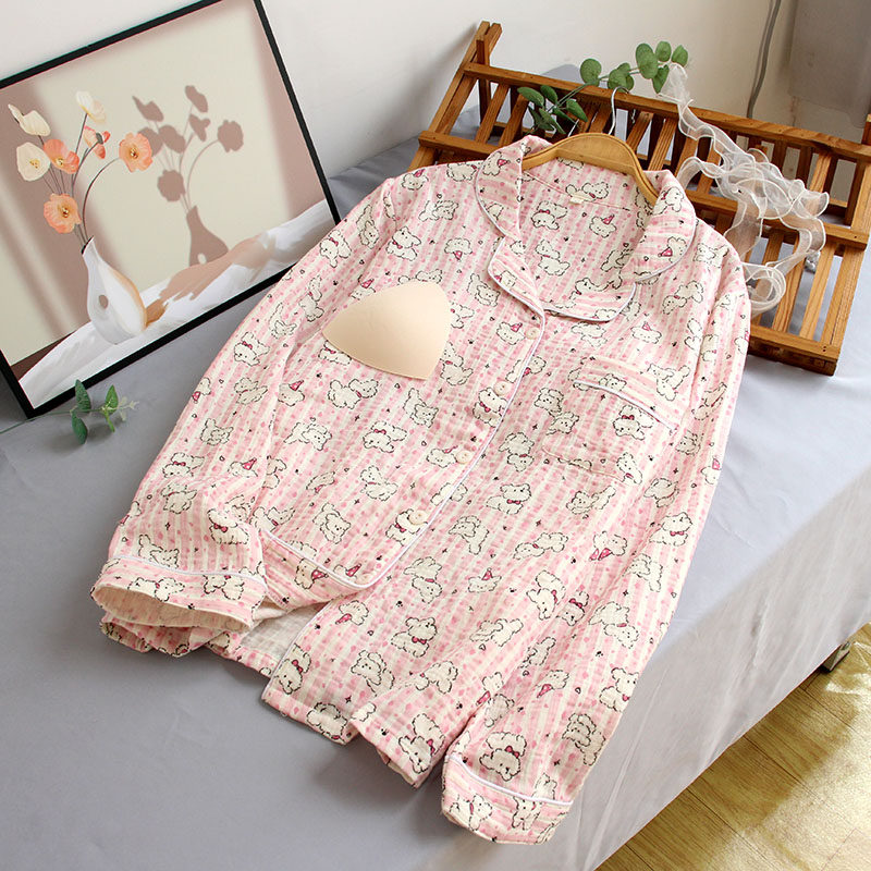 带胸垫棉纱睡衣纯棉双层纱布翻领开衫家居服套装可爱卡通春夏外穿