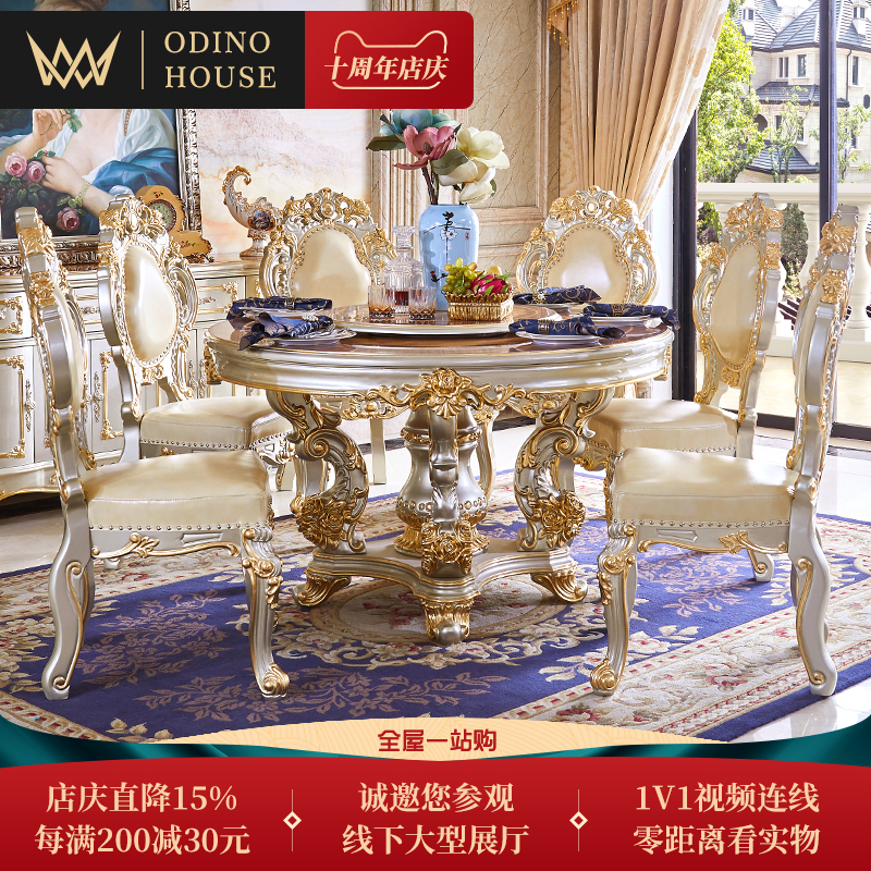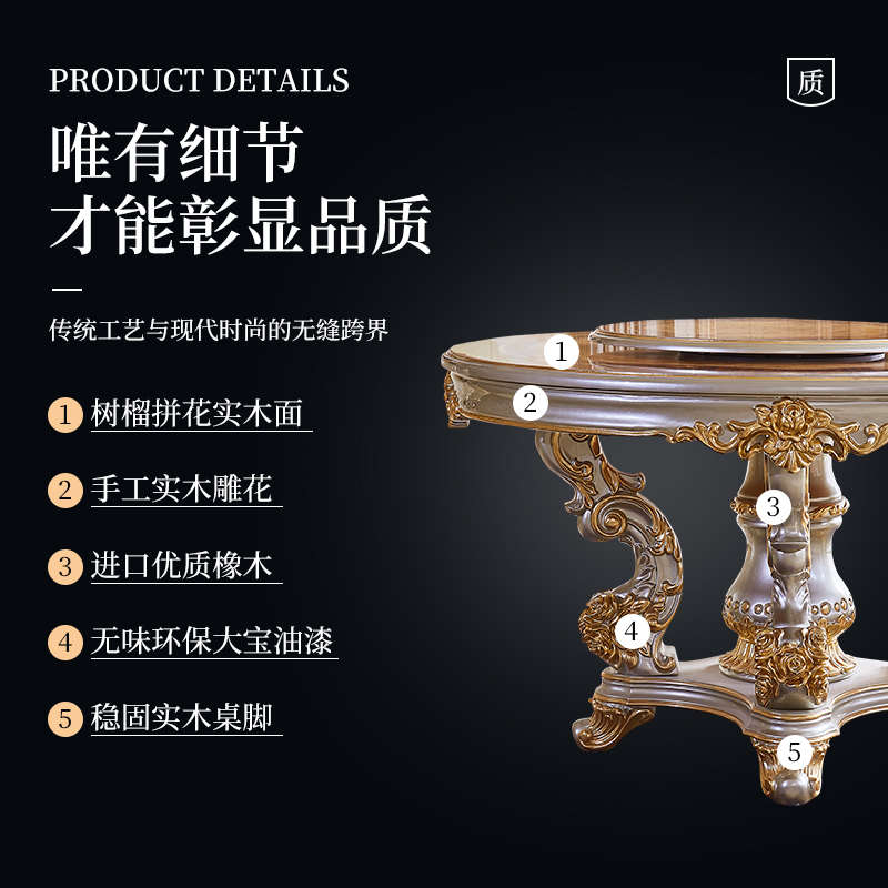 欧式餐桌椅组合大理石圆桌带转盘全实木餐台别墅餐厅豪华圆形饭桌