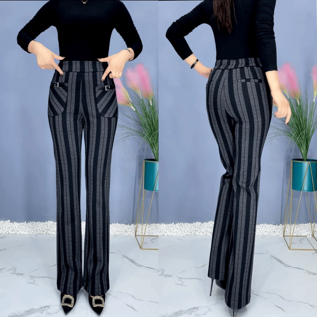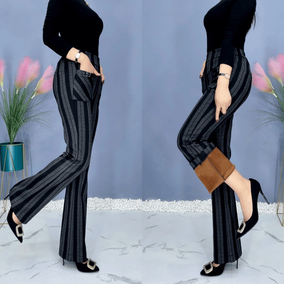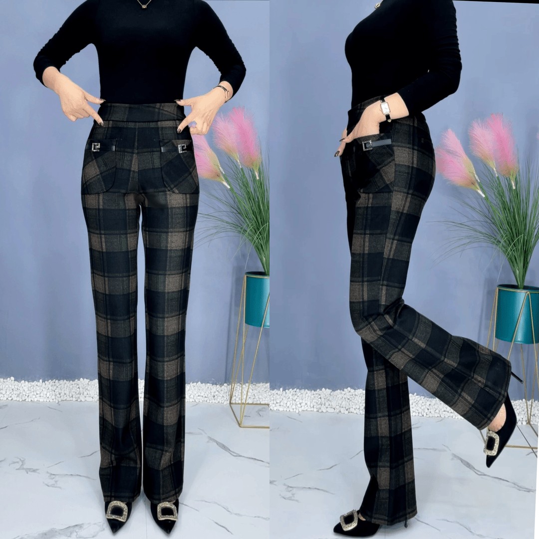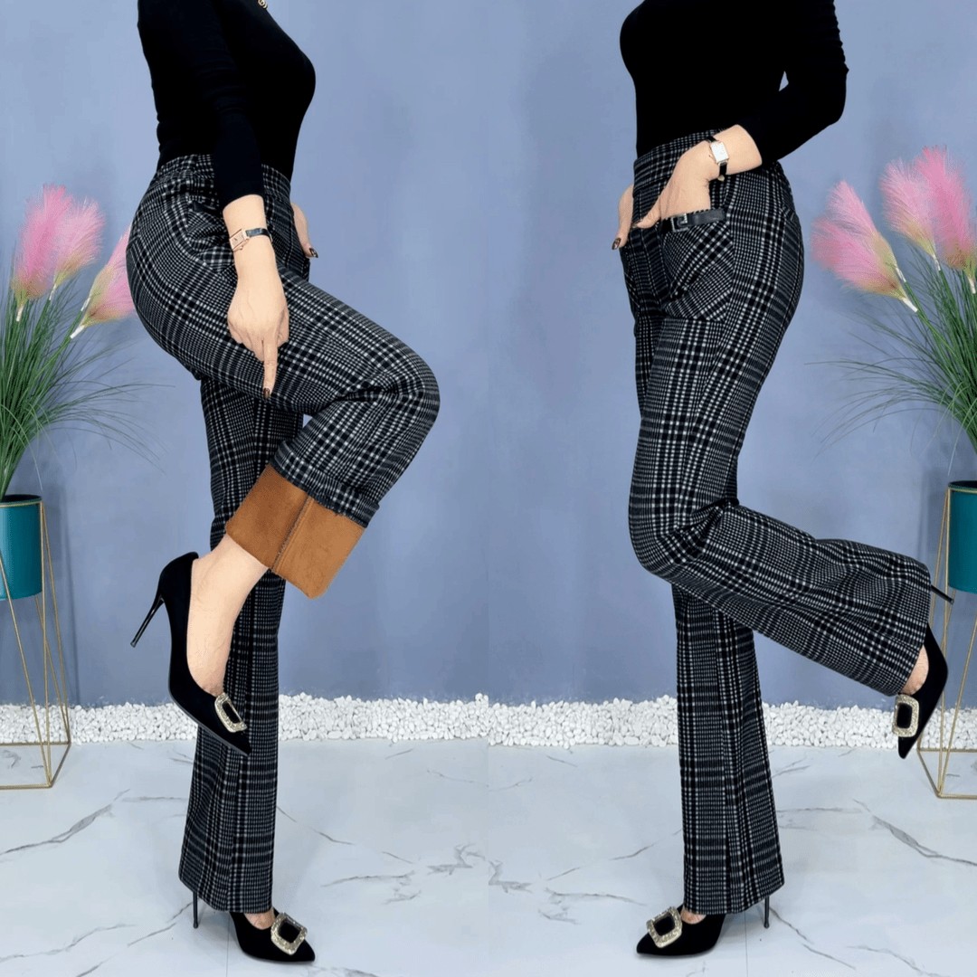 秋冬新款微喇裤中年女士休闲弹力加绒高腰条纹格子妈妈长裤大码