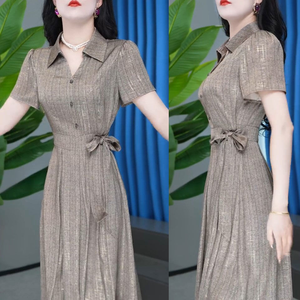 时尚短袖连衣裙女2025年夏季新款气质系带收腰显瘦中长款休闲裙子