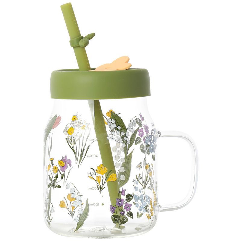 蓝莲花铃兰花吸管杯高硼硅玻璃水杯刻度带盖耐高温网红杯子