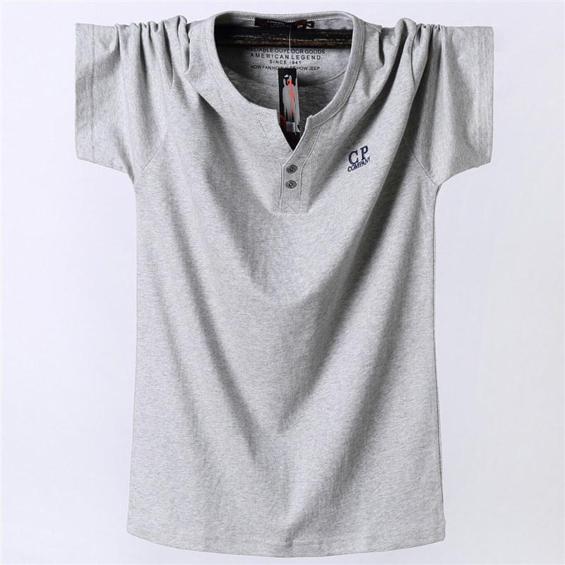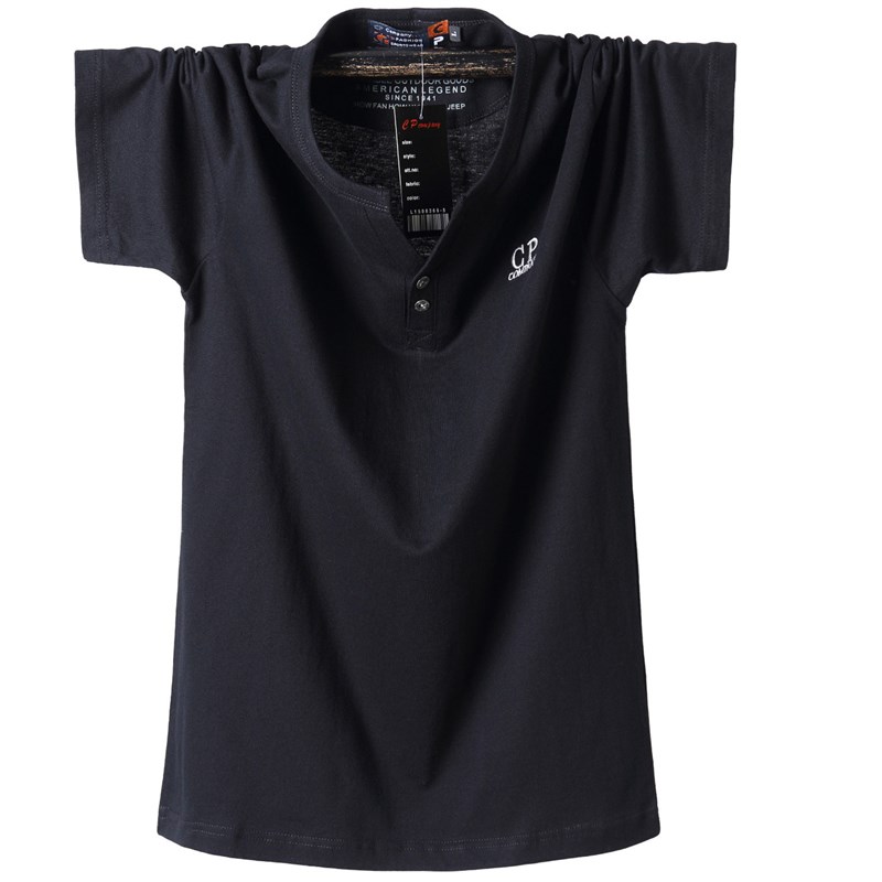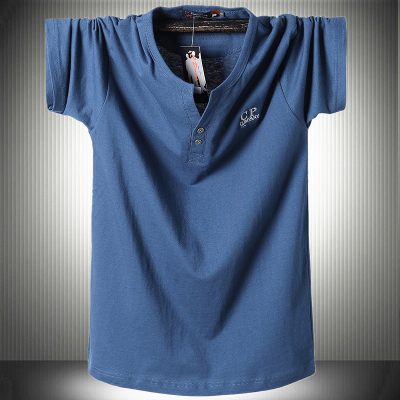 新款男士大尺码短袖t恤纯棉加肥牛仔蓝微胖型半截袖小V钮扣领上衣