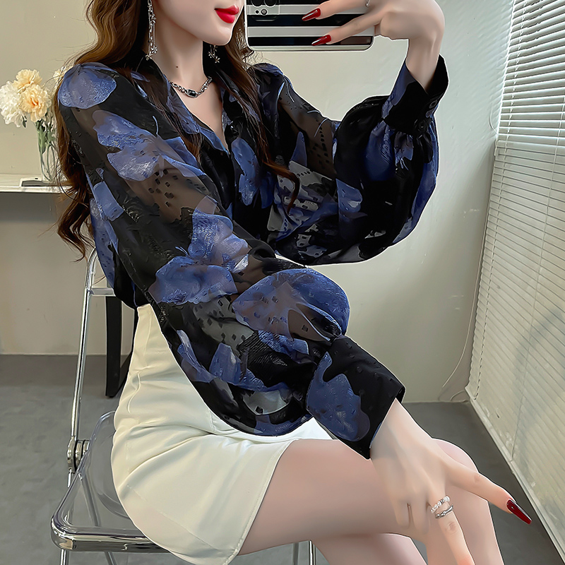复古轻奢女士雪纺衬衫小众蝴蝶刺绣印花衬衣宽松设计灯笼袖上衣秋