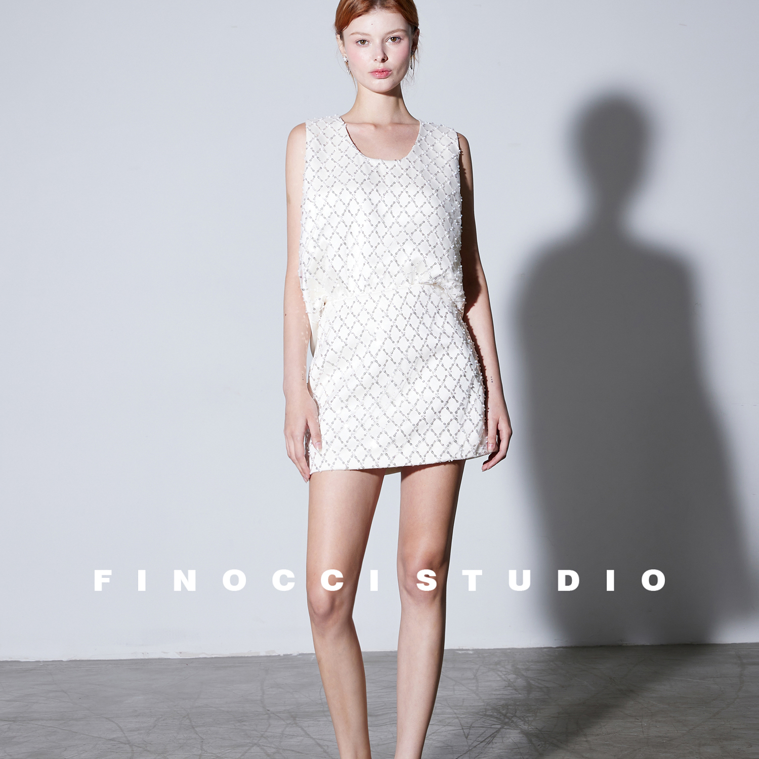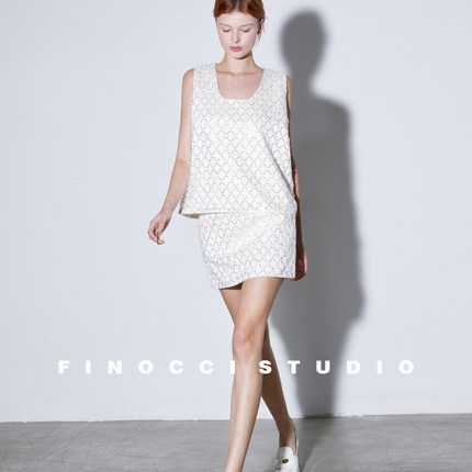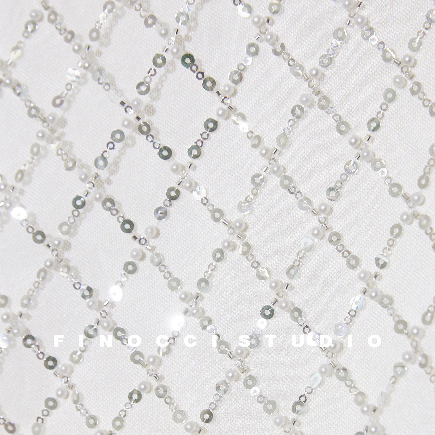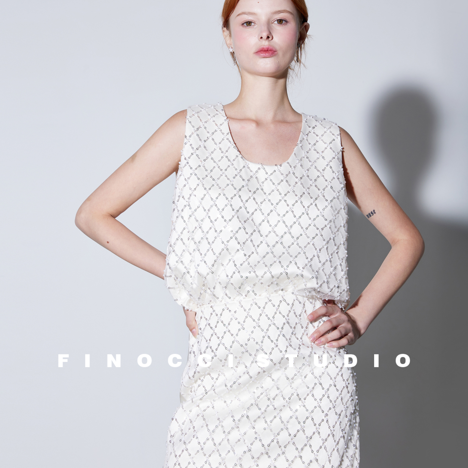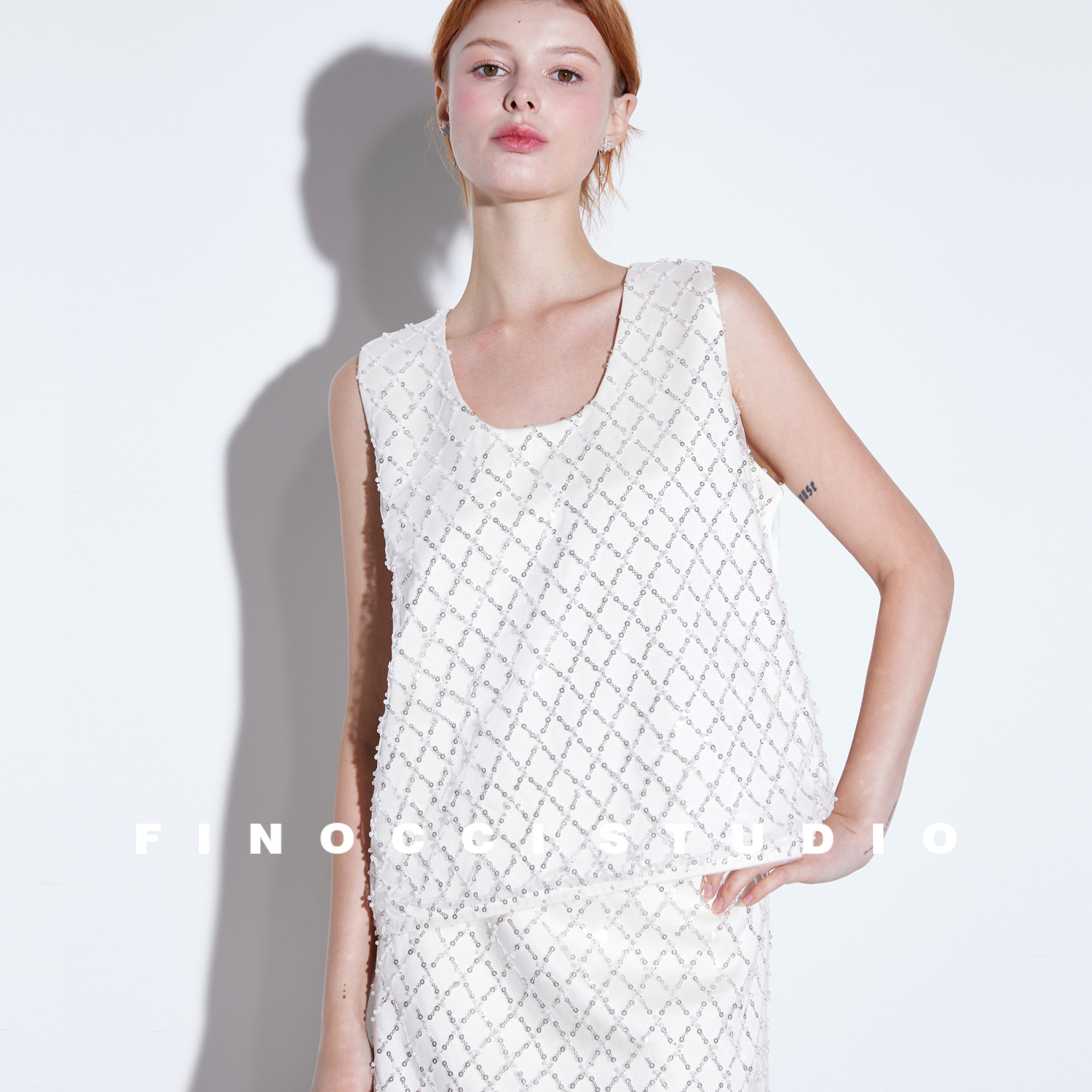 FINOCCI奢华璀璨鎏光珍珠宝石菱形刺绣高密缎面慵懒背心半裙套装