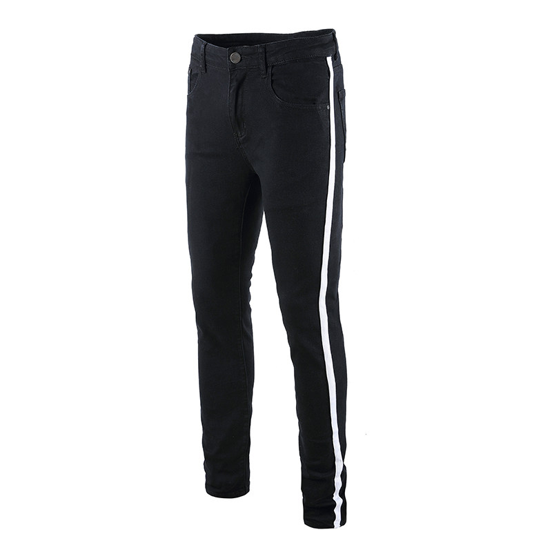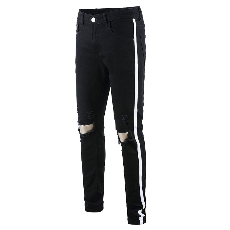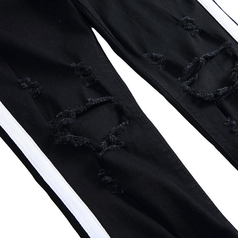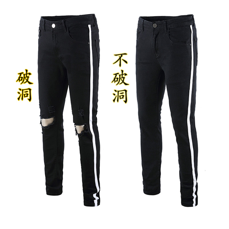高街潮流个性条纹织带牛仔裤修身长裤男士黑色弹力膝盖破洞小脚裤