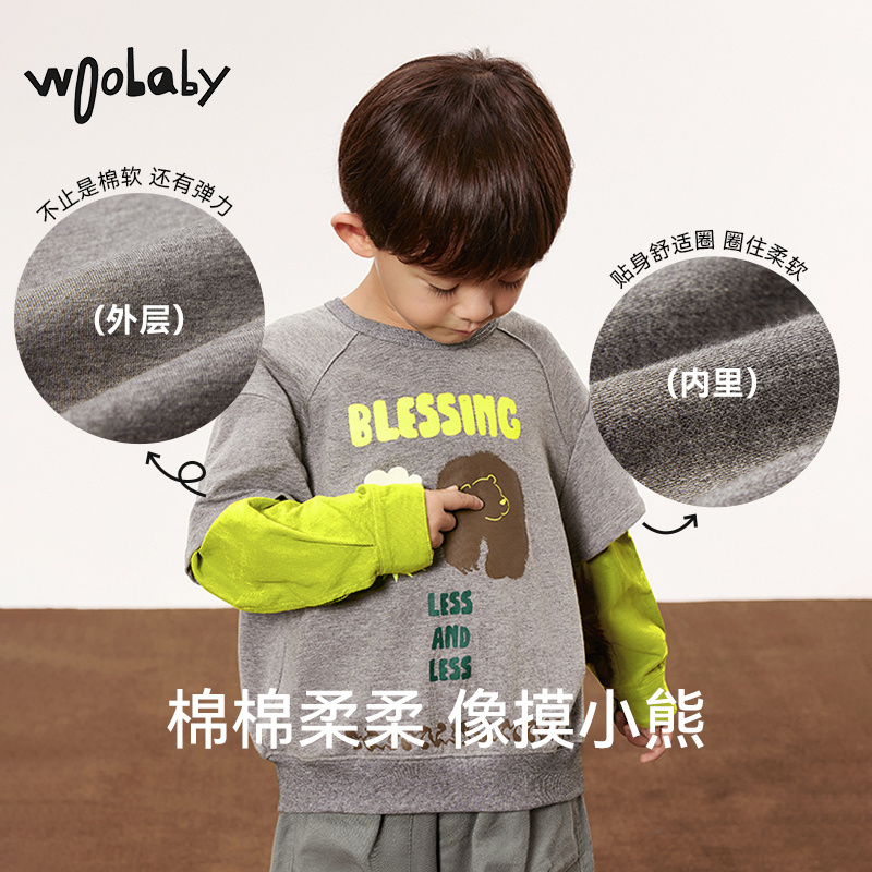 woobaby撞色衬衫拼接假两件儿童长袖T恤男女童春秋装上衣打底衫