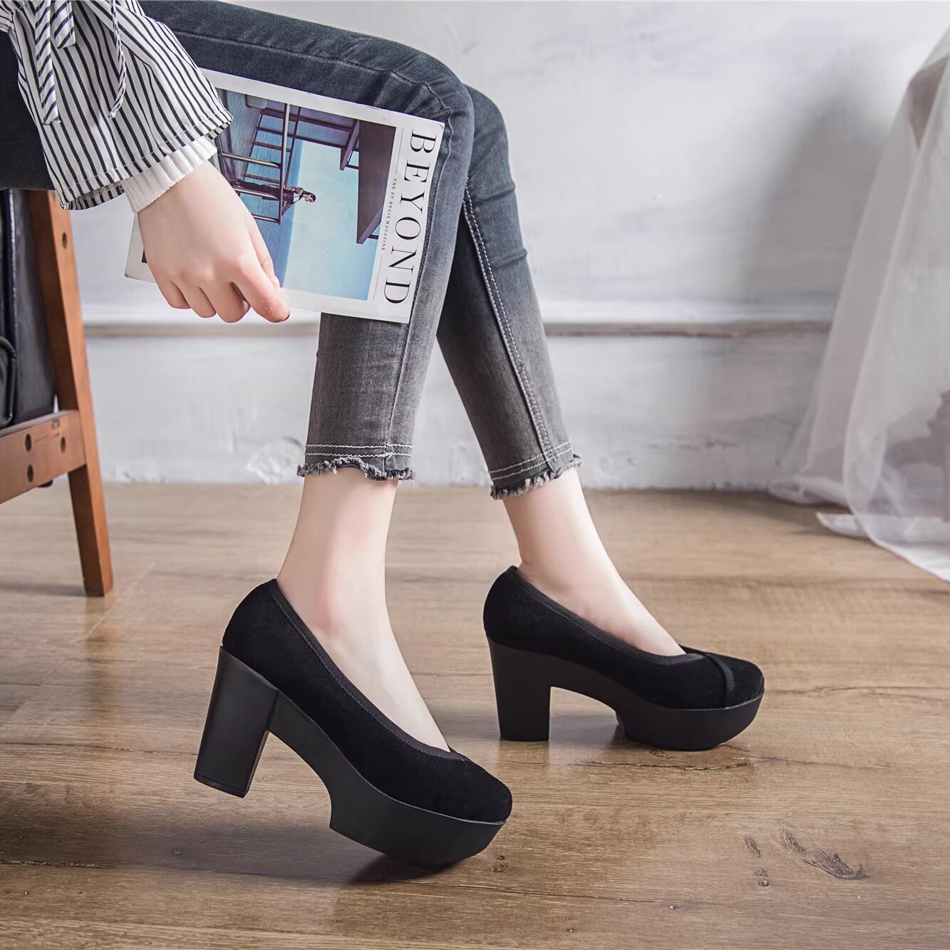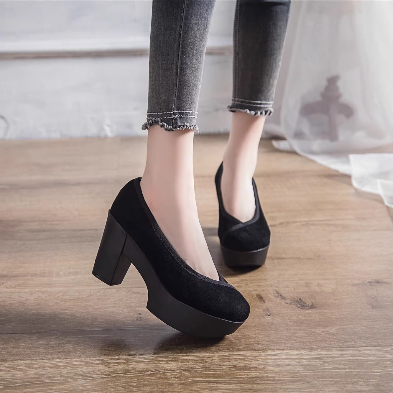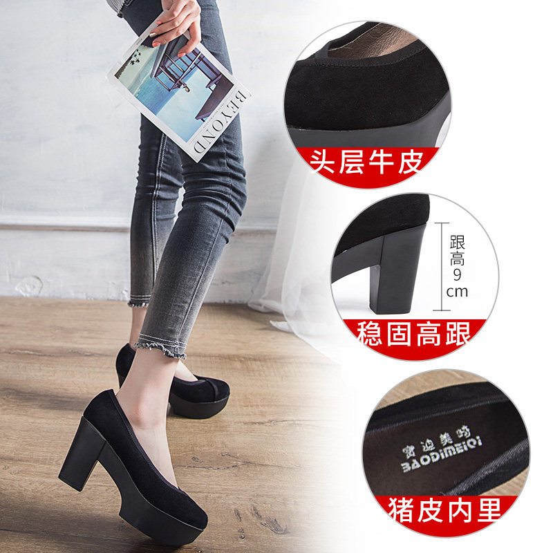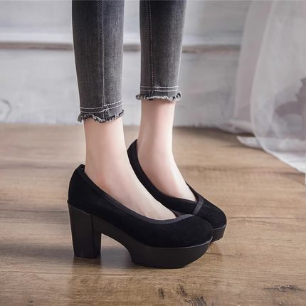网红复古新款圆头绒面粗跟奶奶鞋