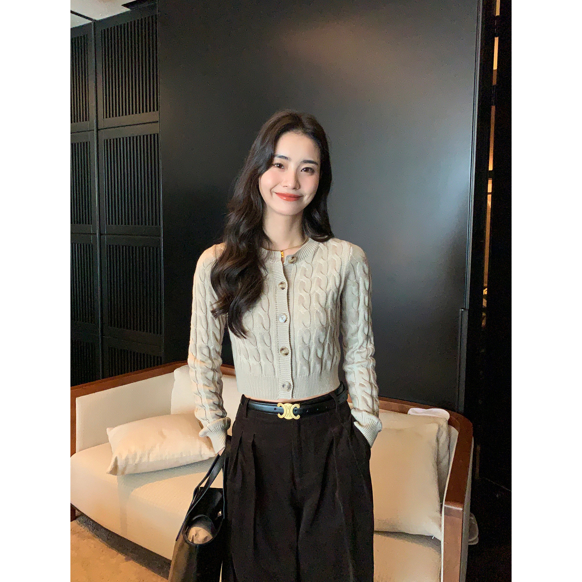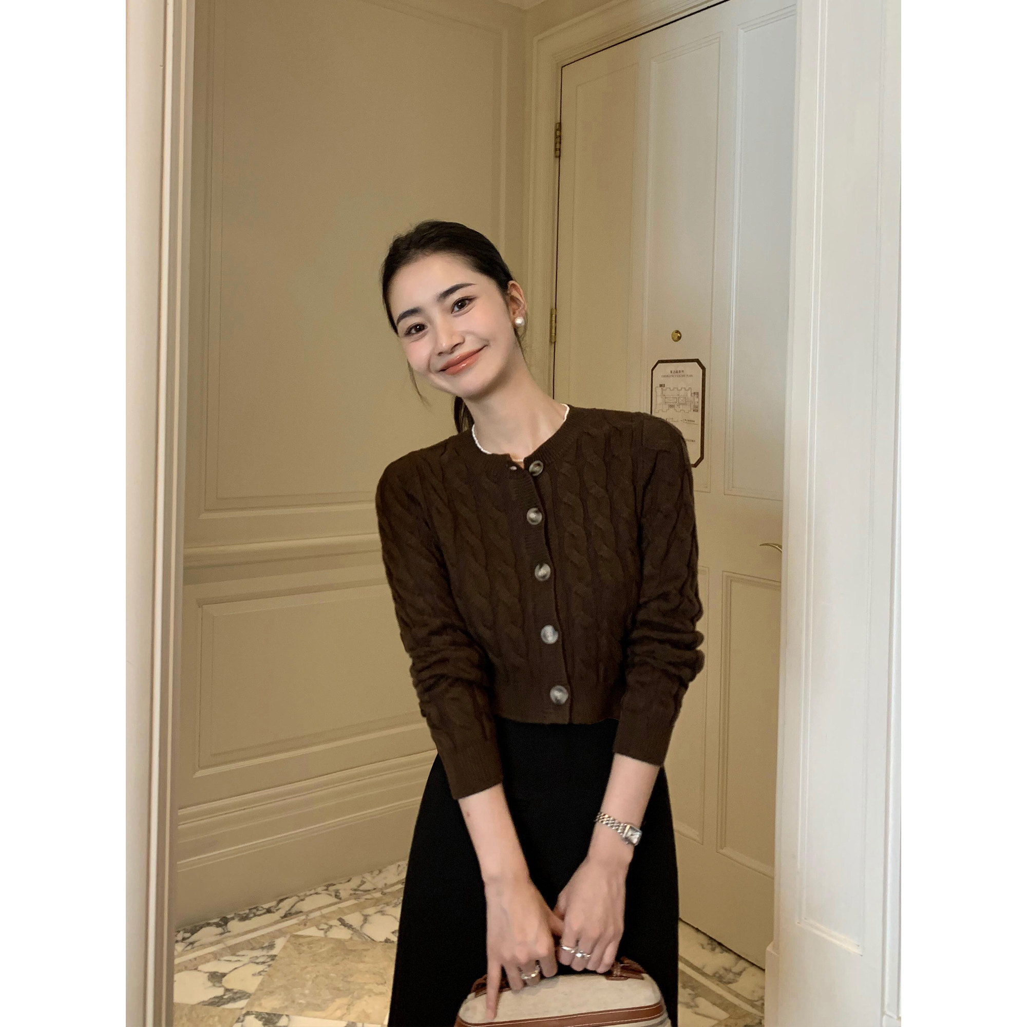 pusumede 里约慢调 麻花毛衣开衫女外穿短款圆领气质打底针织上衣