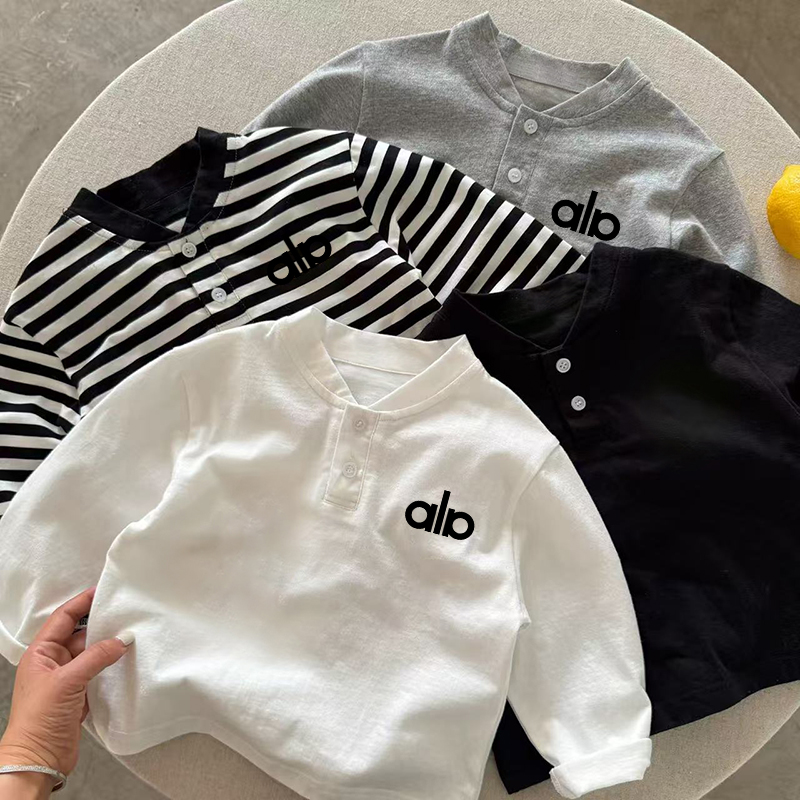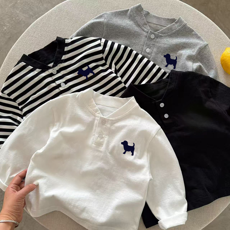 男女童亨利领长袖T恤卡通洋气打底上衣春秋季纯棉白色长袖Polo衫