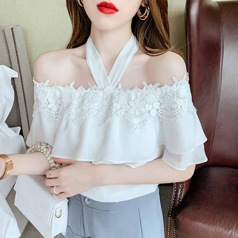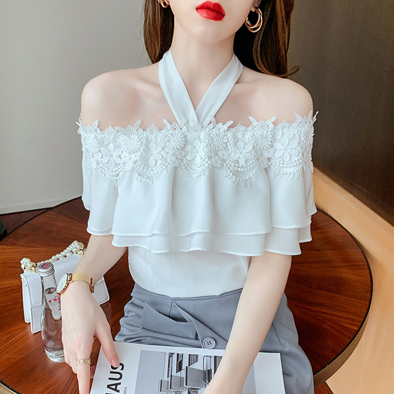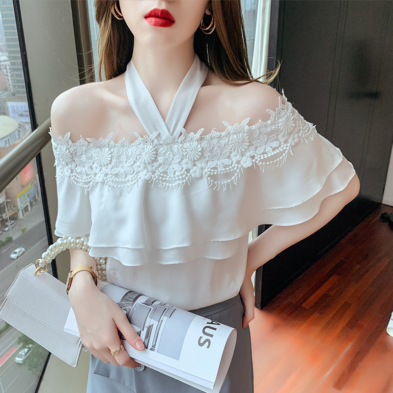 雪纺衫女短袖夏季薄款2024新款性感露锁骨洋气时尚一字领露肩上衣