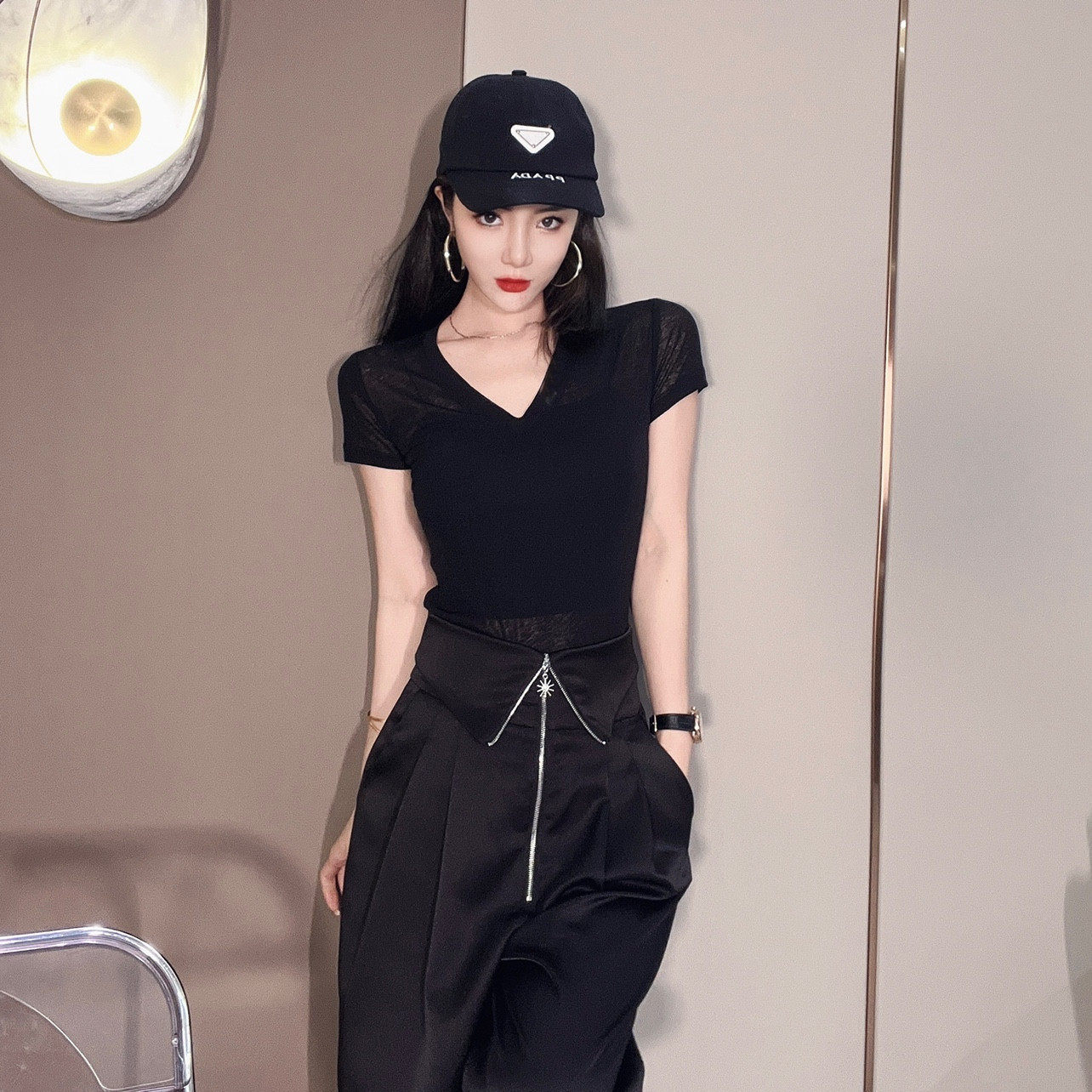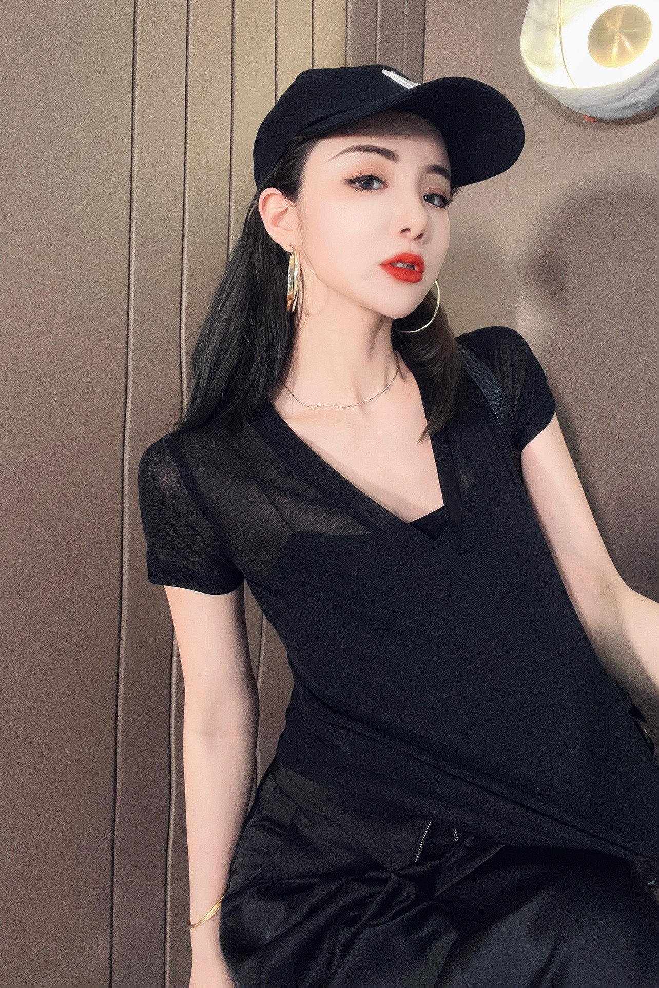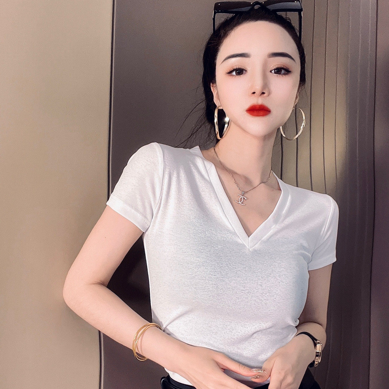 短袖韩版薄款V领T恤冰丝女
