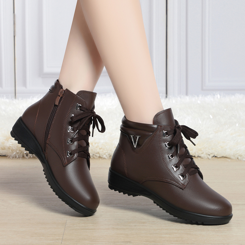 真皮妈妈鞋子女冬季款加绒女鞋皮鞋短靴防滑保暖女靴中老年人棉鞋