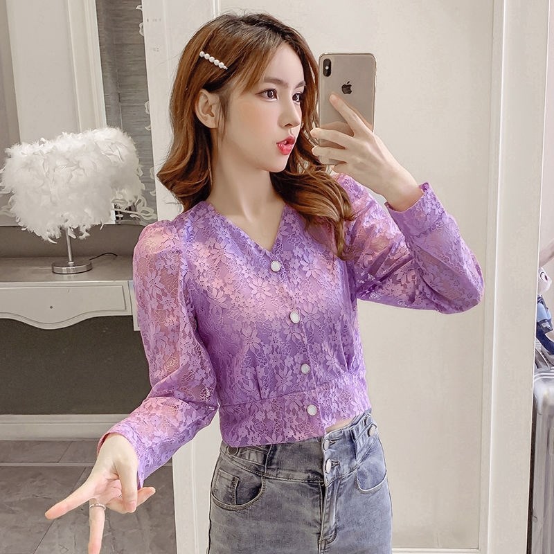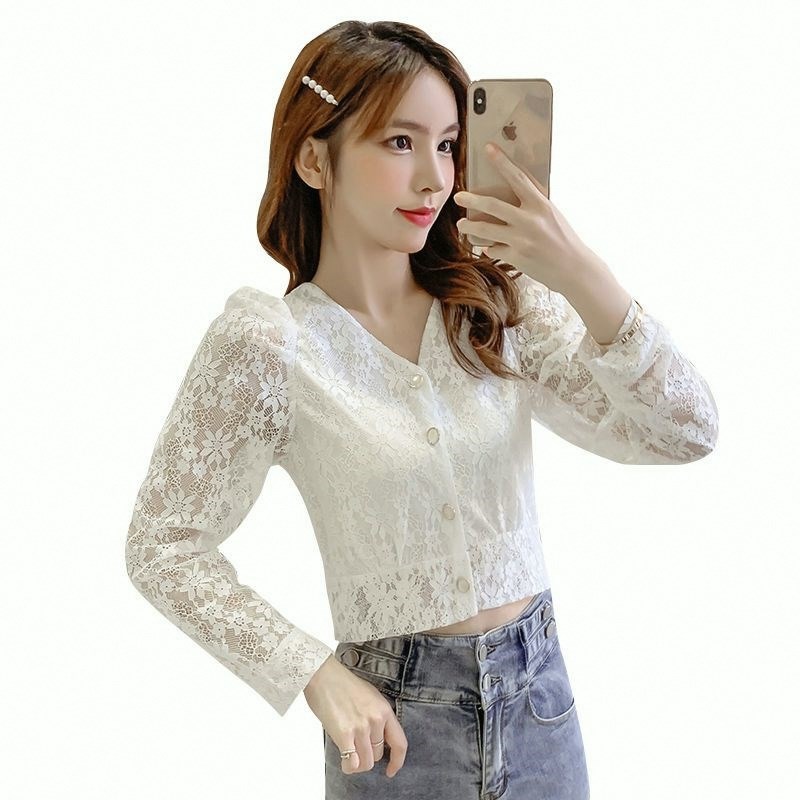 2024春装新款V领气质蕾丝衬衫女洋气短款上衣潮高腰露脐打底衫女