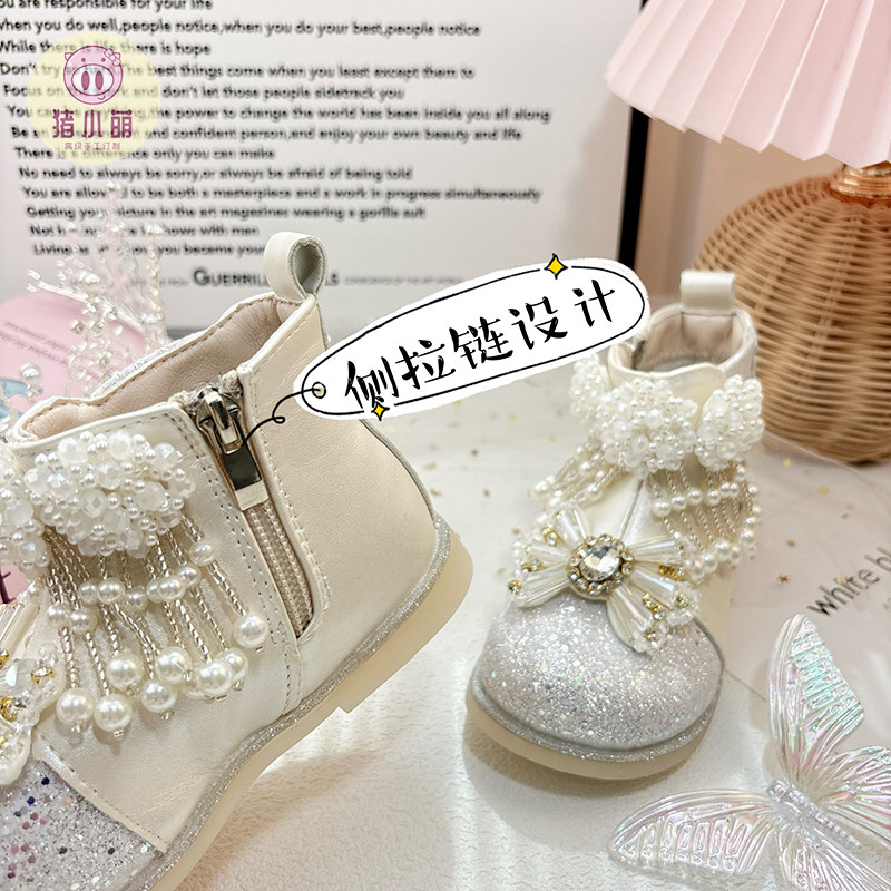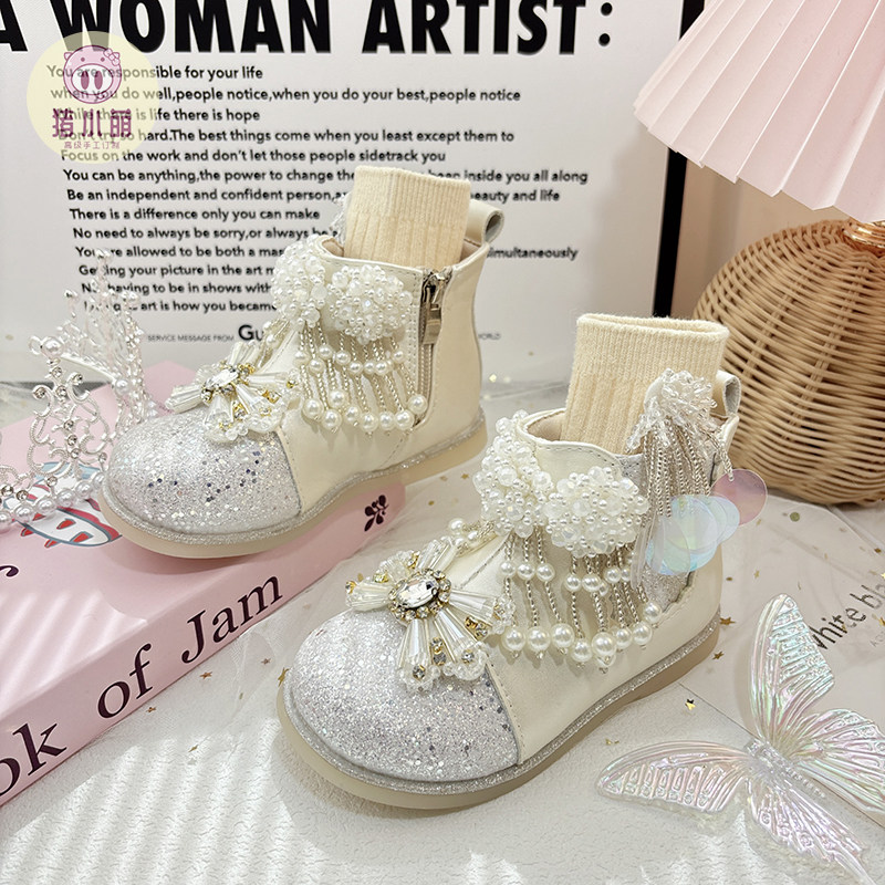 女童白色短靴秋冬珍珠水钻流苏马丁靴公主小女孩加绒皮靴儿童鞋子