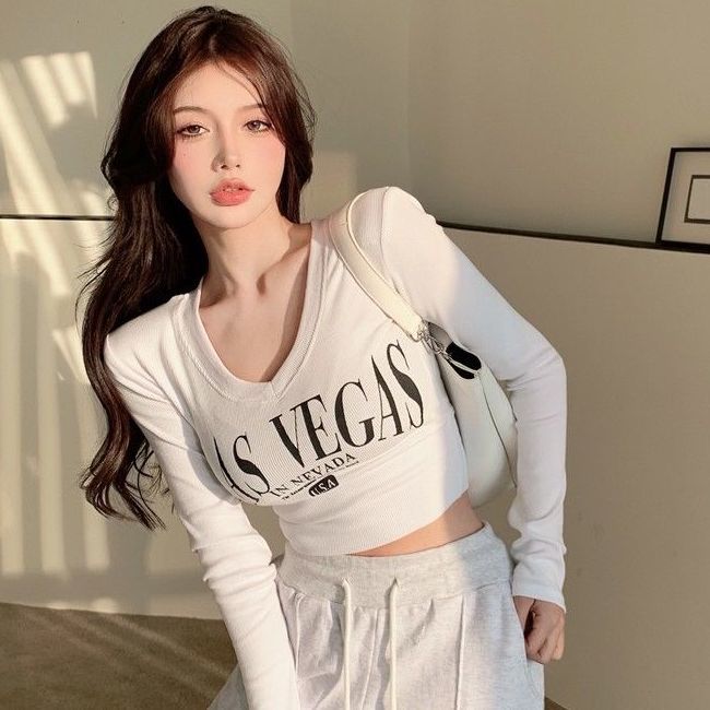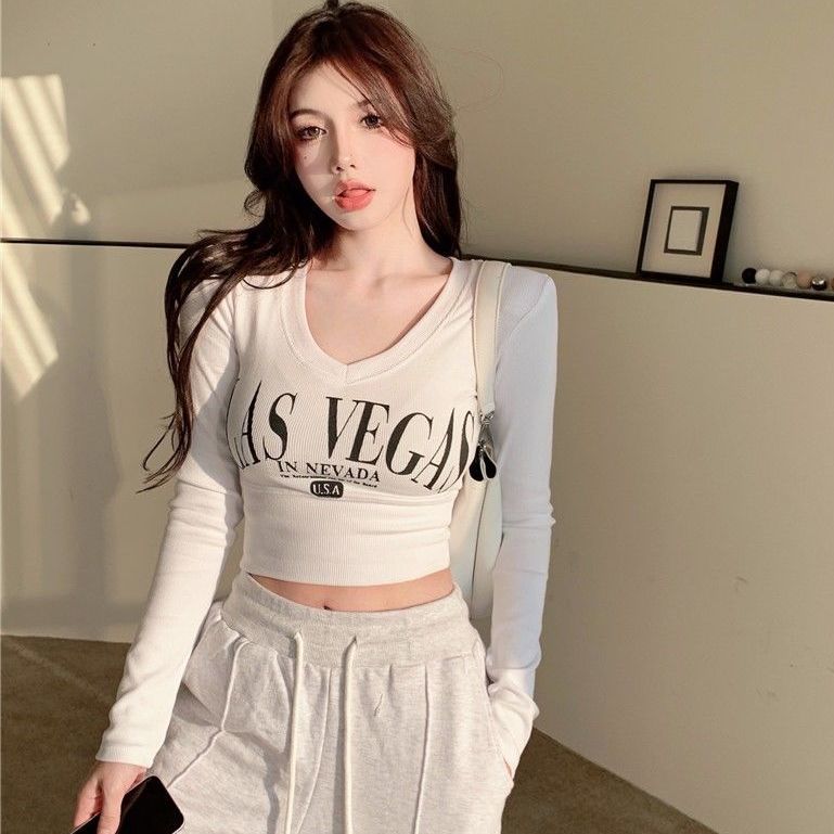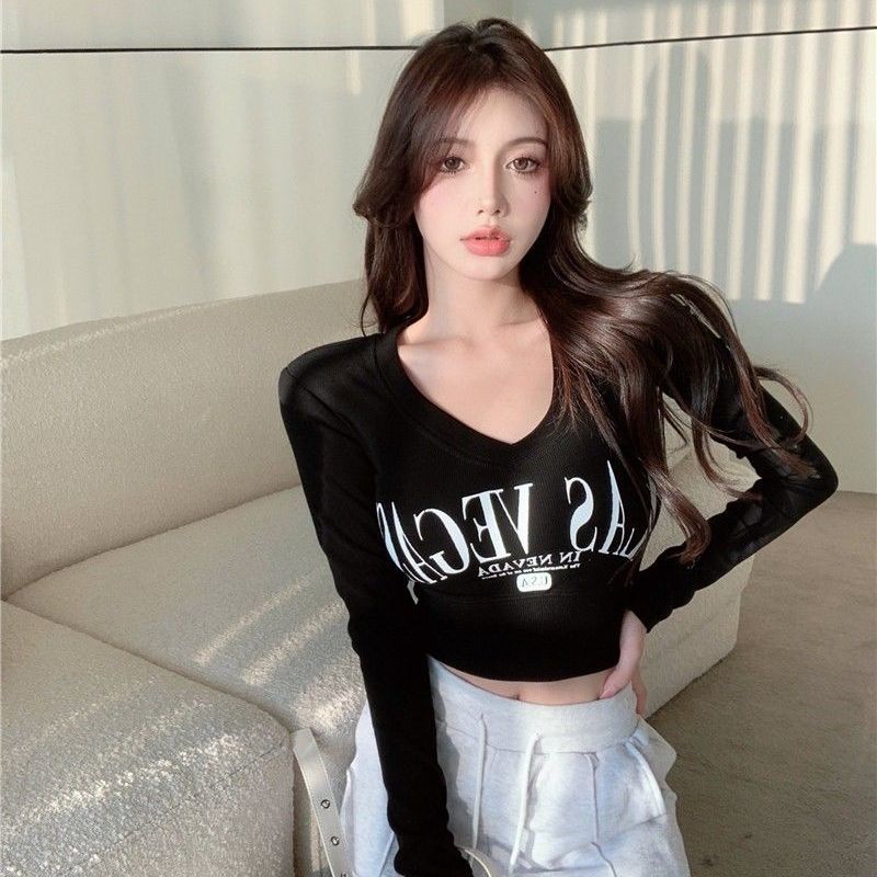 V领短款打底衫女内搭字母印花高腰露脐长袖上衣秋性感辣妹紧身t恤