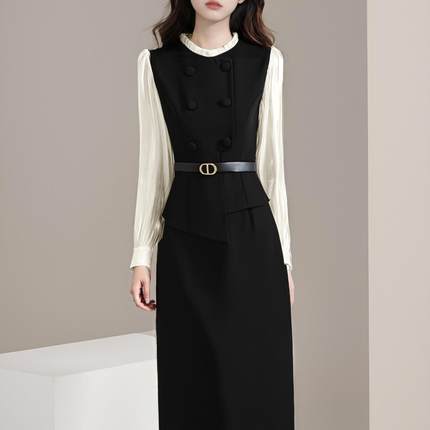 长袖拼接气质通勤假两件2025春季新款系带修身包臀女装连衣裙2116