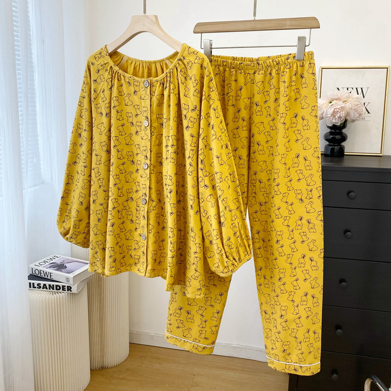 纯棉睡衣套装女春秋磨毛绒布卡通印花开衫上衣两件套宽松休闲长裤