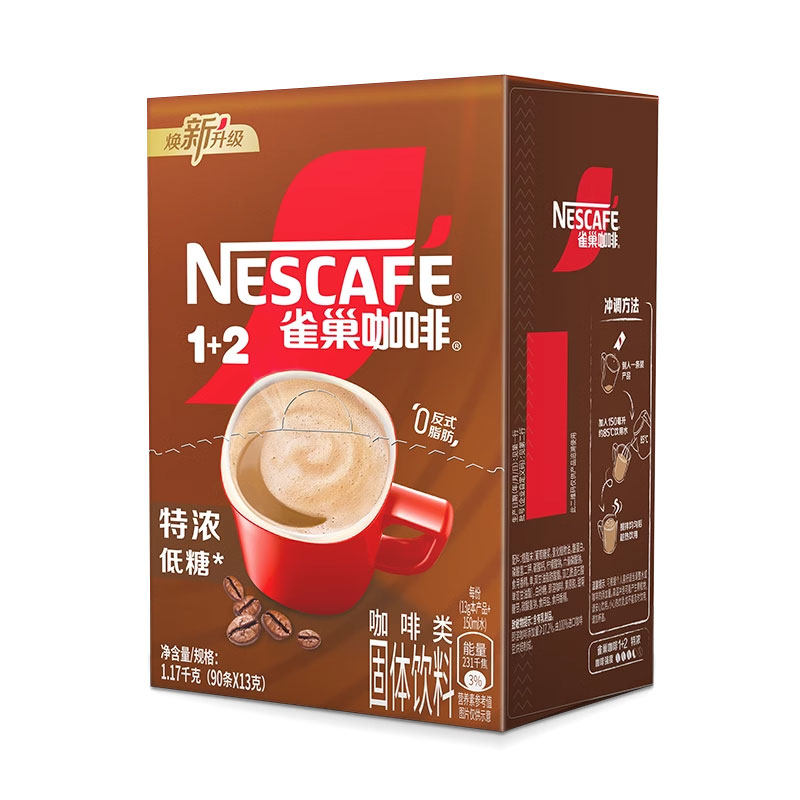 雀巢咖啡特浓1+2官方店90条盒装三合一速溶咖啡粉低糖提神正品批