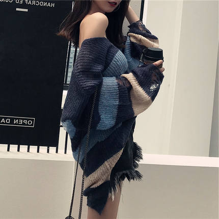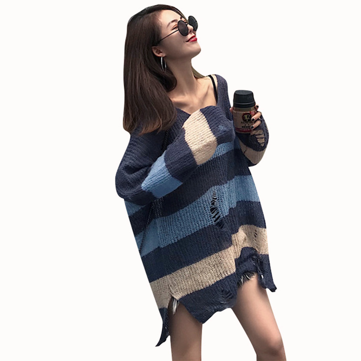 宽松慵懒破洞毛衣女早秋新款镂空针织衫女破烂上衣中长款夏季春装