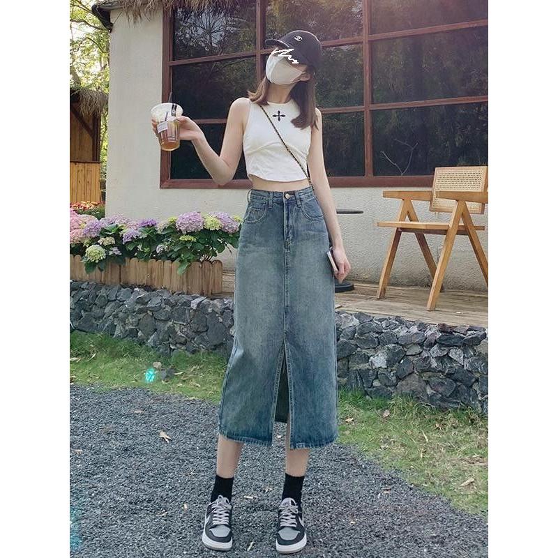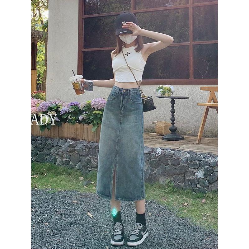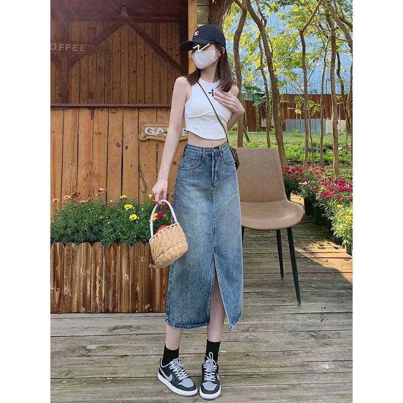 小个子前开叉高腰半身牛仔裙女春秋新款浅蓝色显瘦包臀A字中长裙