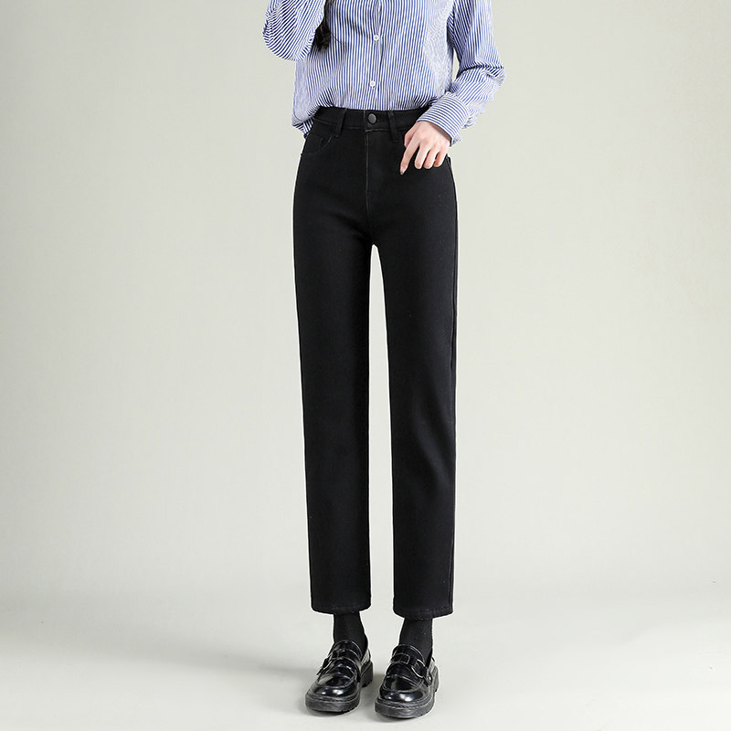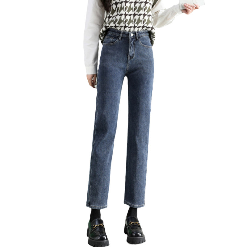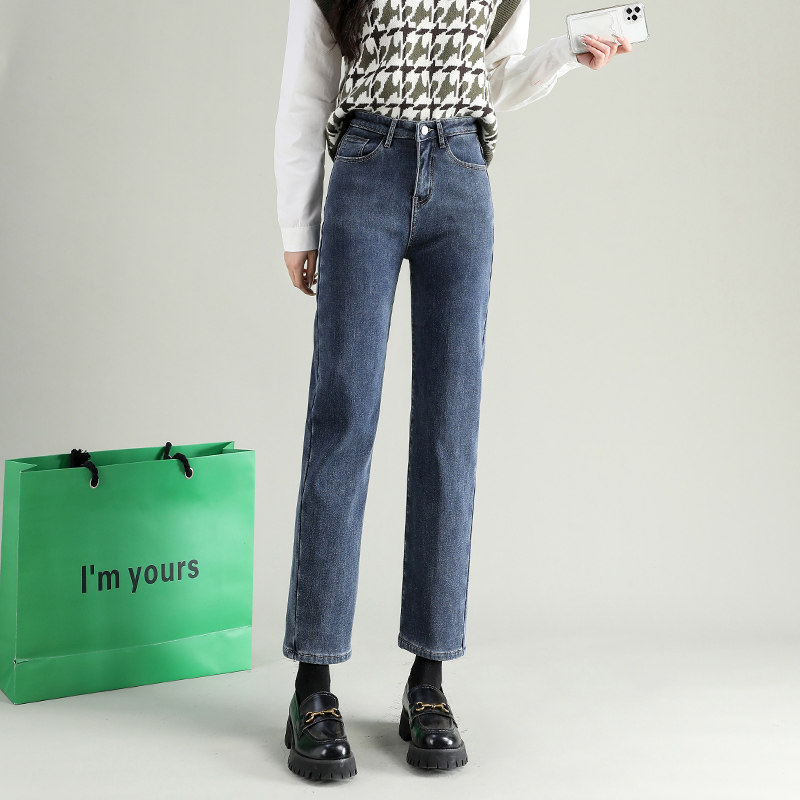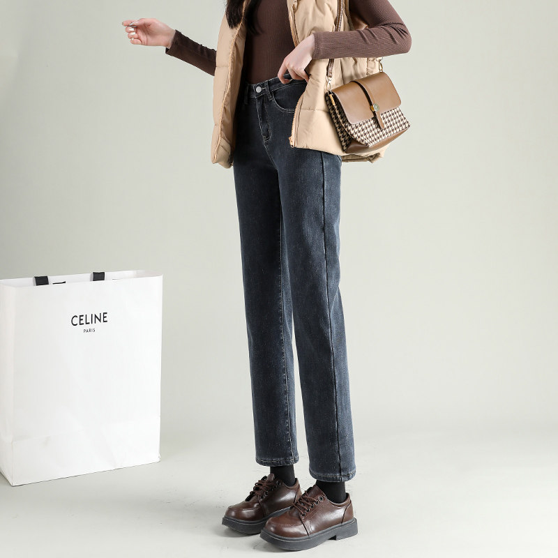 加绒直筒牛仔裤女2024年新款秋冬季高腰显瘦九分小个子保暖烟管裤