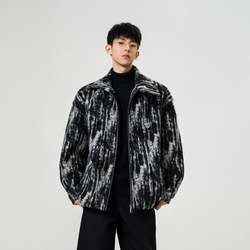 美式复古扎染毛呢大衣男短款立领风衣秋季高级感呢子外套轻奢男装