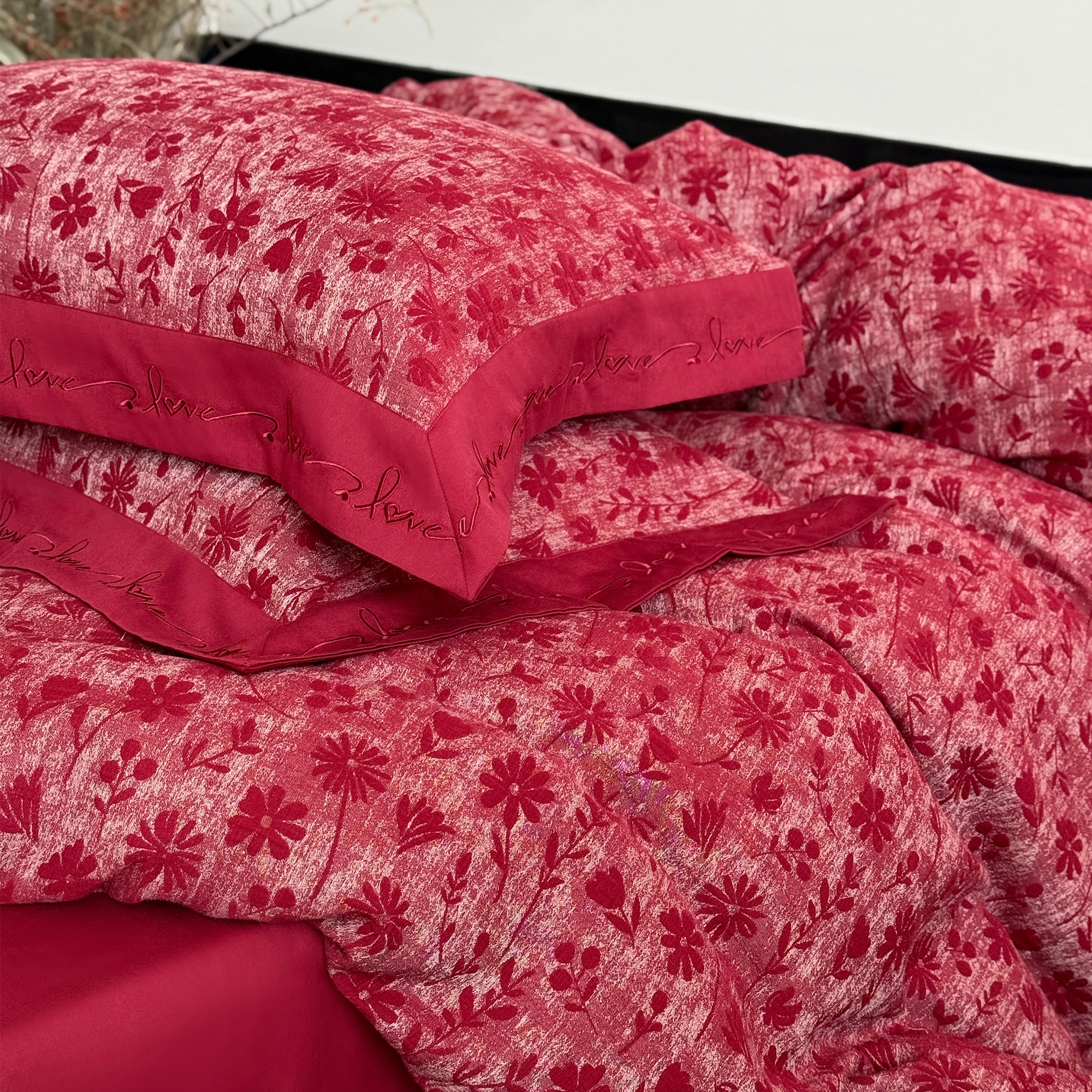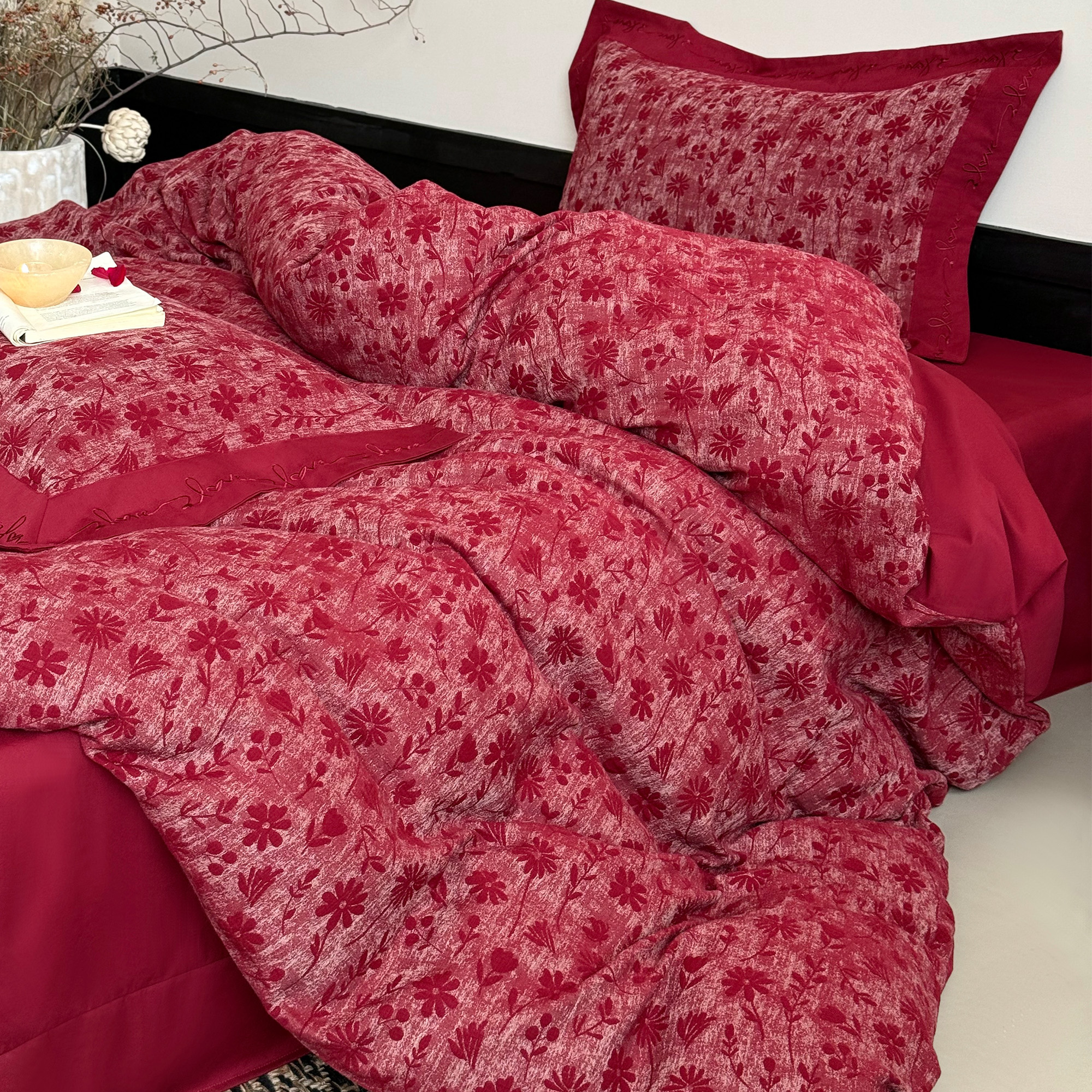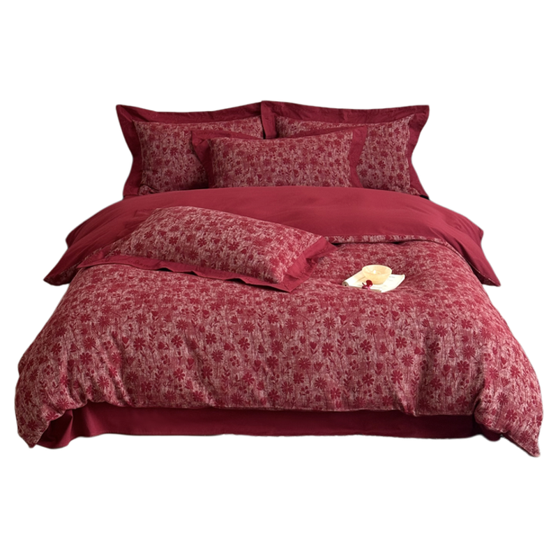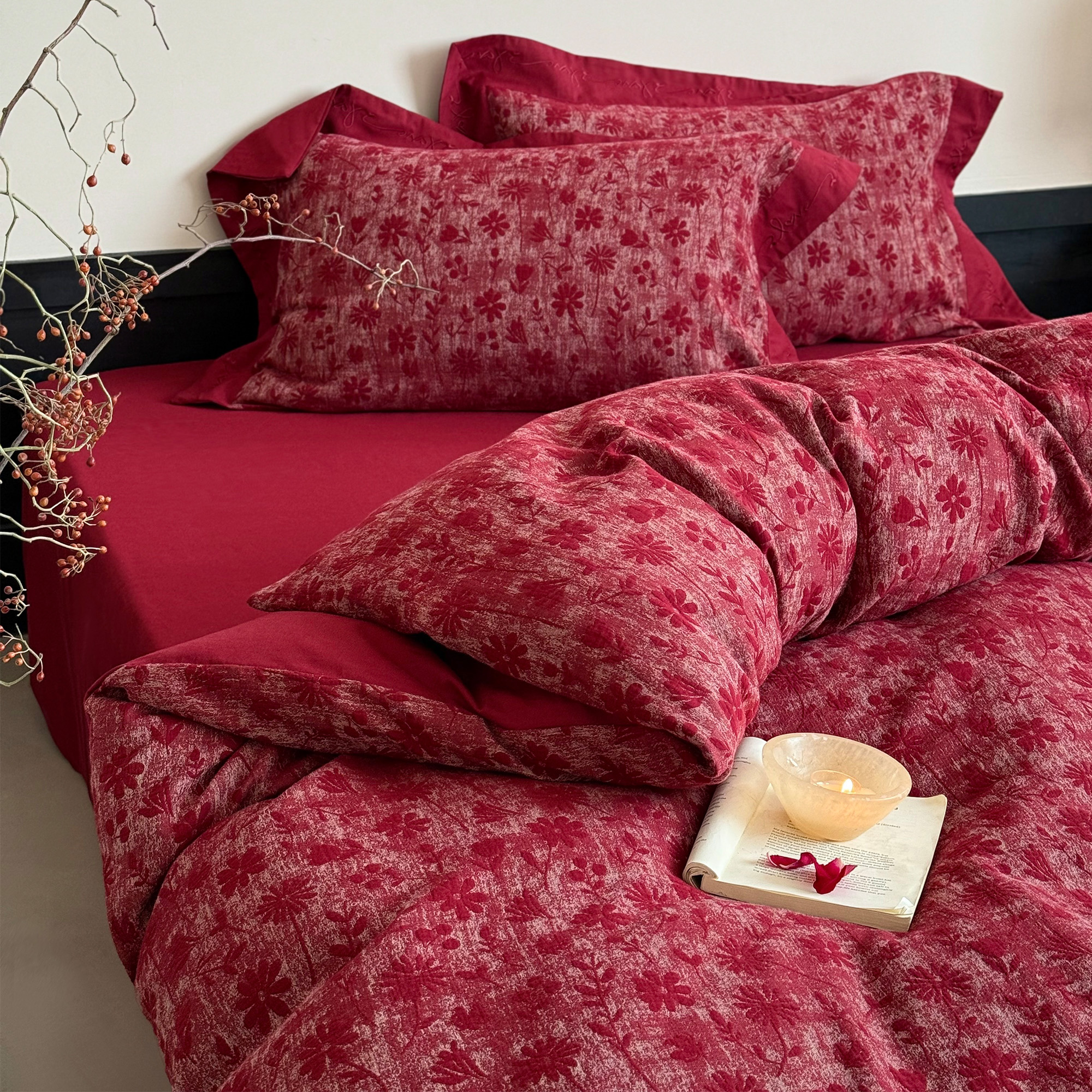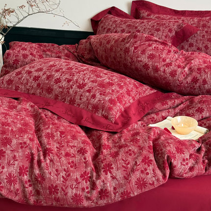 花与春光色织提花婚庆四件套全棉浪漫酒红色结婚被套床单床上用品