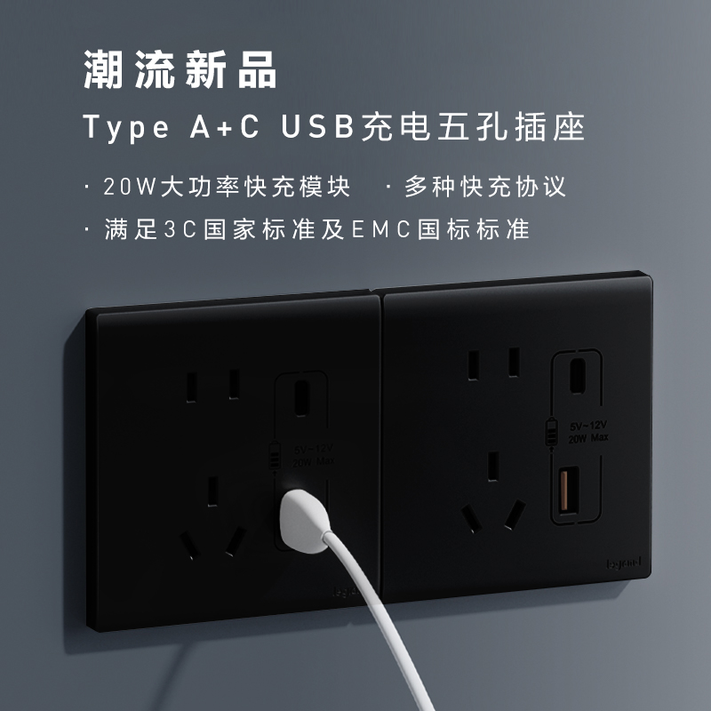 罗格朗五孔开关插座面板简悦石墨黑16a内嵌式二三插家用电源86型