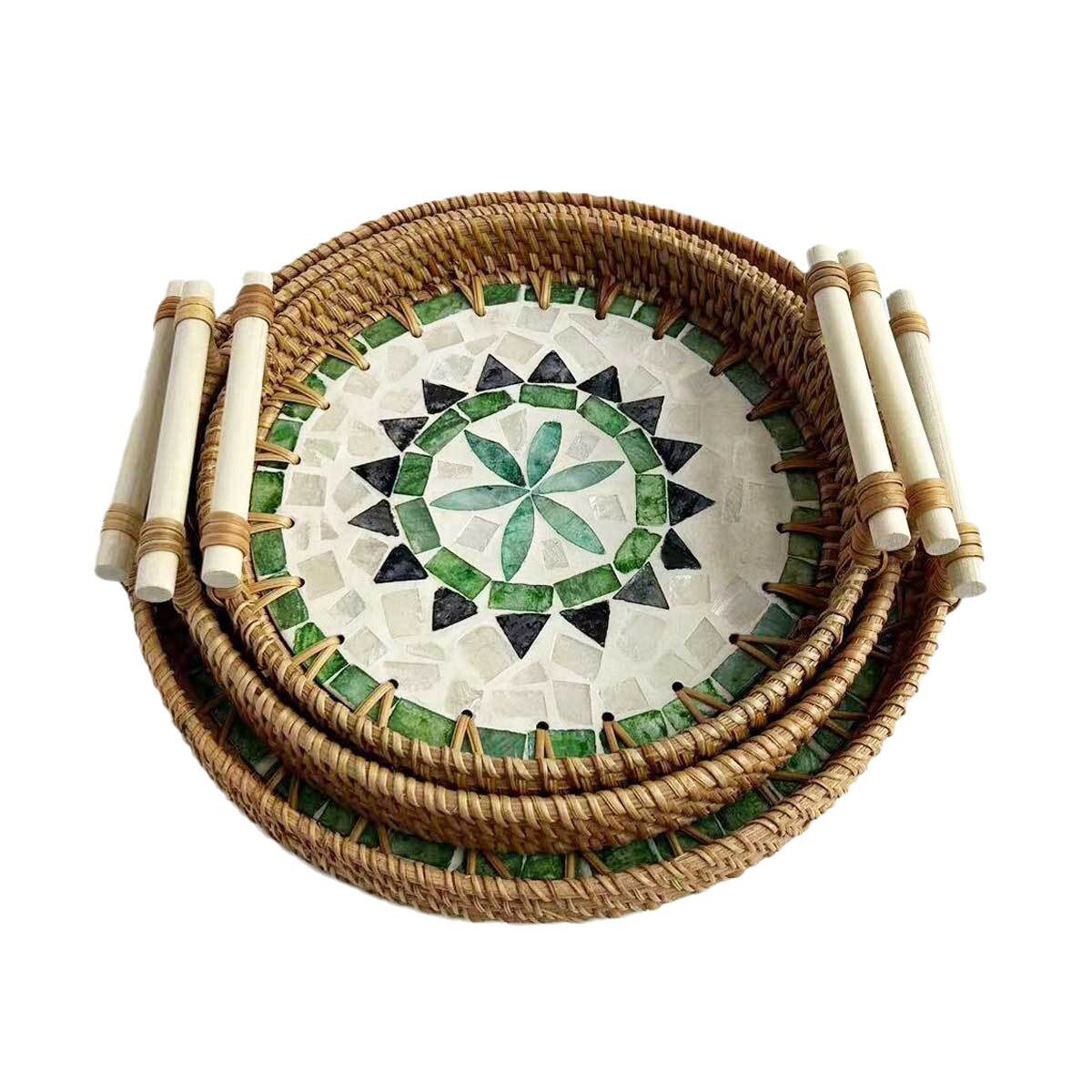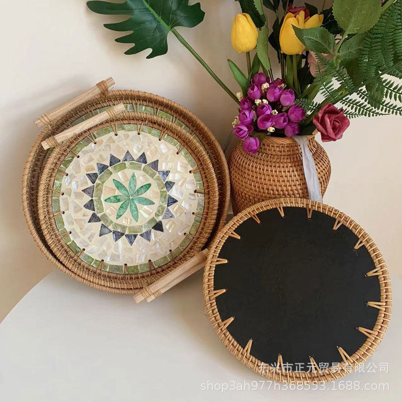 藤编贝壳托盘贝壳水果盘编织早餐篮北欧风面包筐创意双耳篮收纳盘
