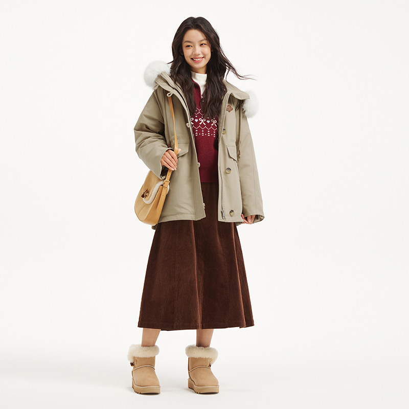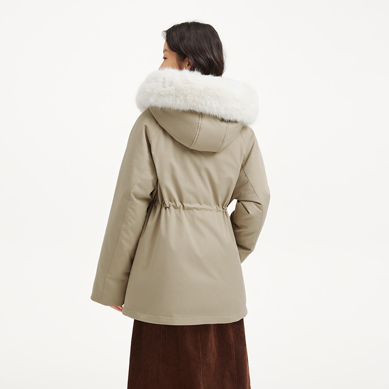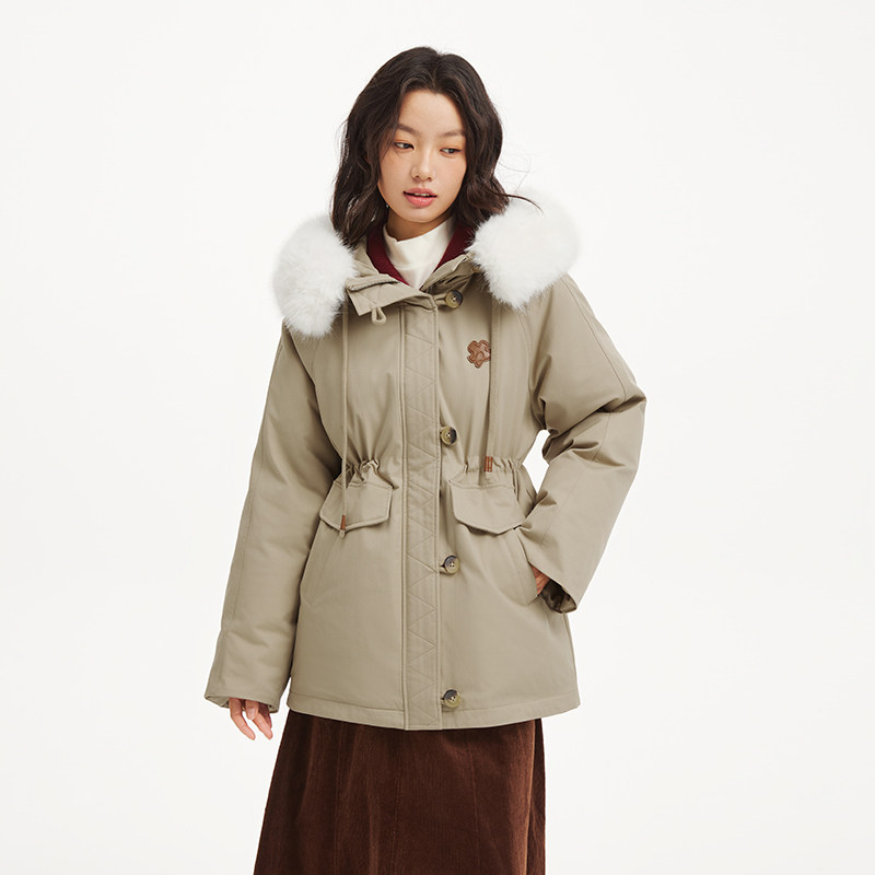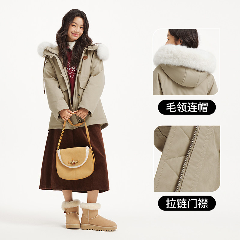 热风女士毛领羽绒服2025年冬季新款中长款收腰户外连帽派克羽绒服
