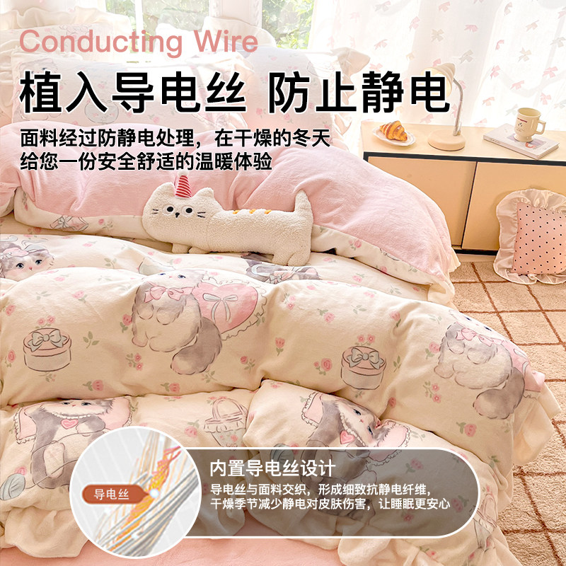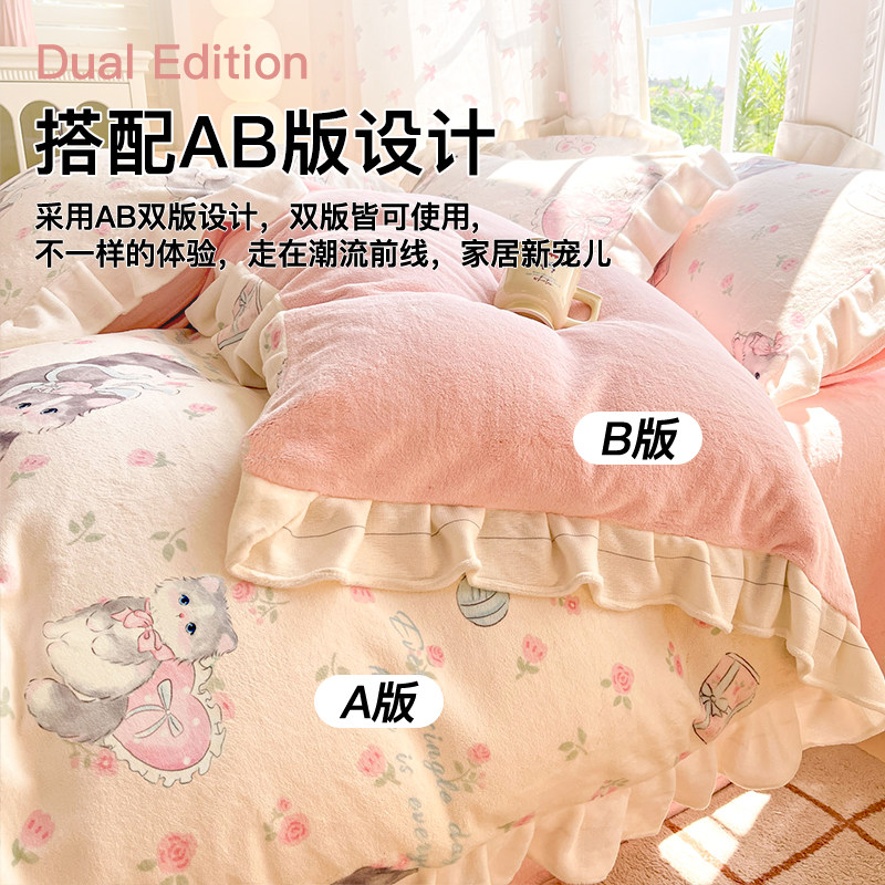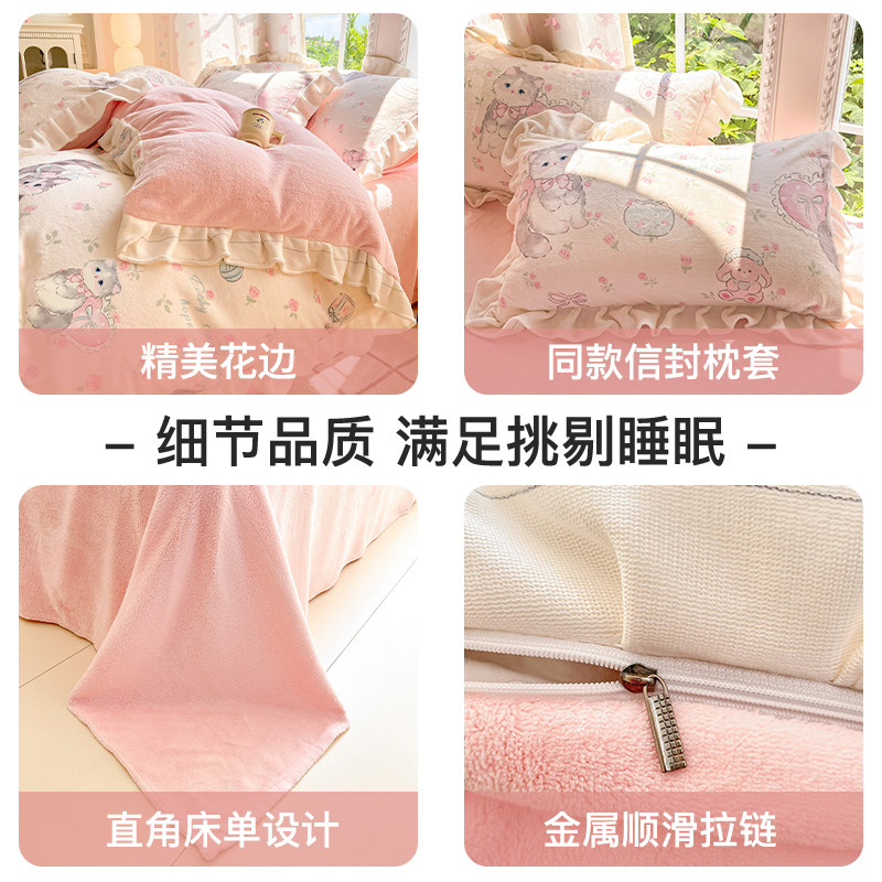 牛奶绒床上四件套加厚珊瑚绒双面加绒被套法兰绒床单三件套花边款