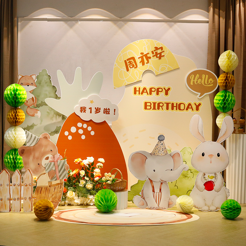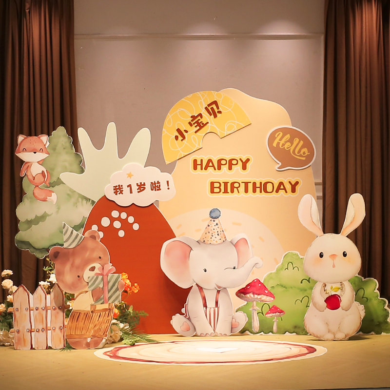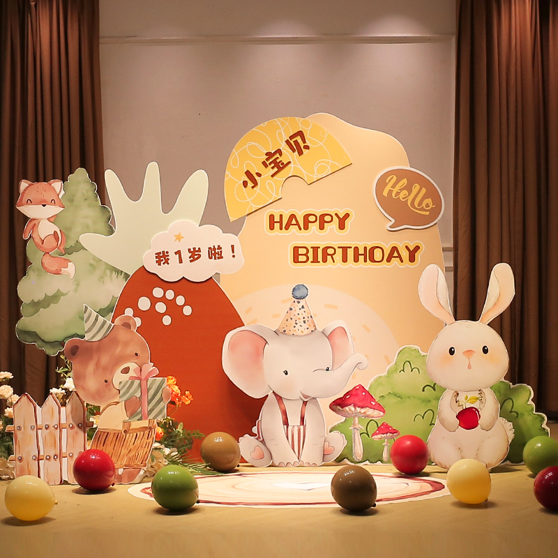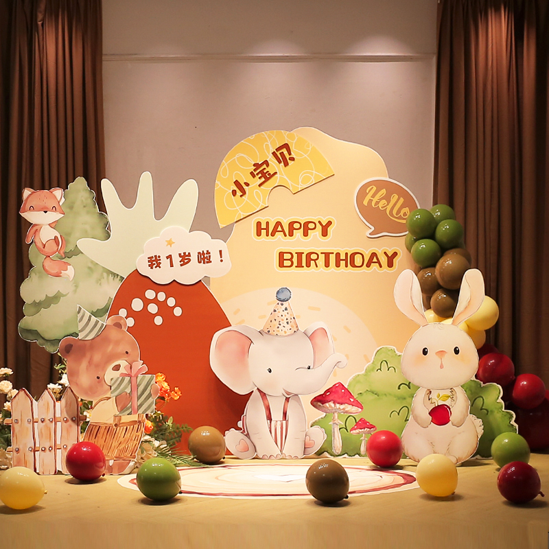 森系宝宝周岁生日场景布置装饰满月酒百天宴男女手绘动物kt板定制