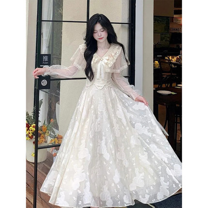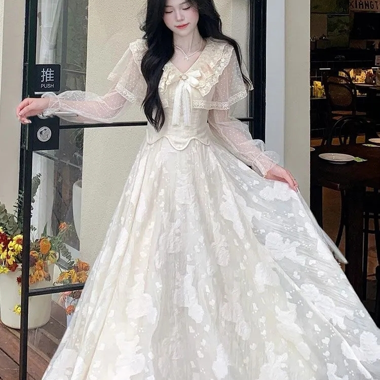 法式宫廷风气质斗篷重工长袖连衣裙女夏季新款网纱拼接收腰长裙子