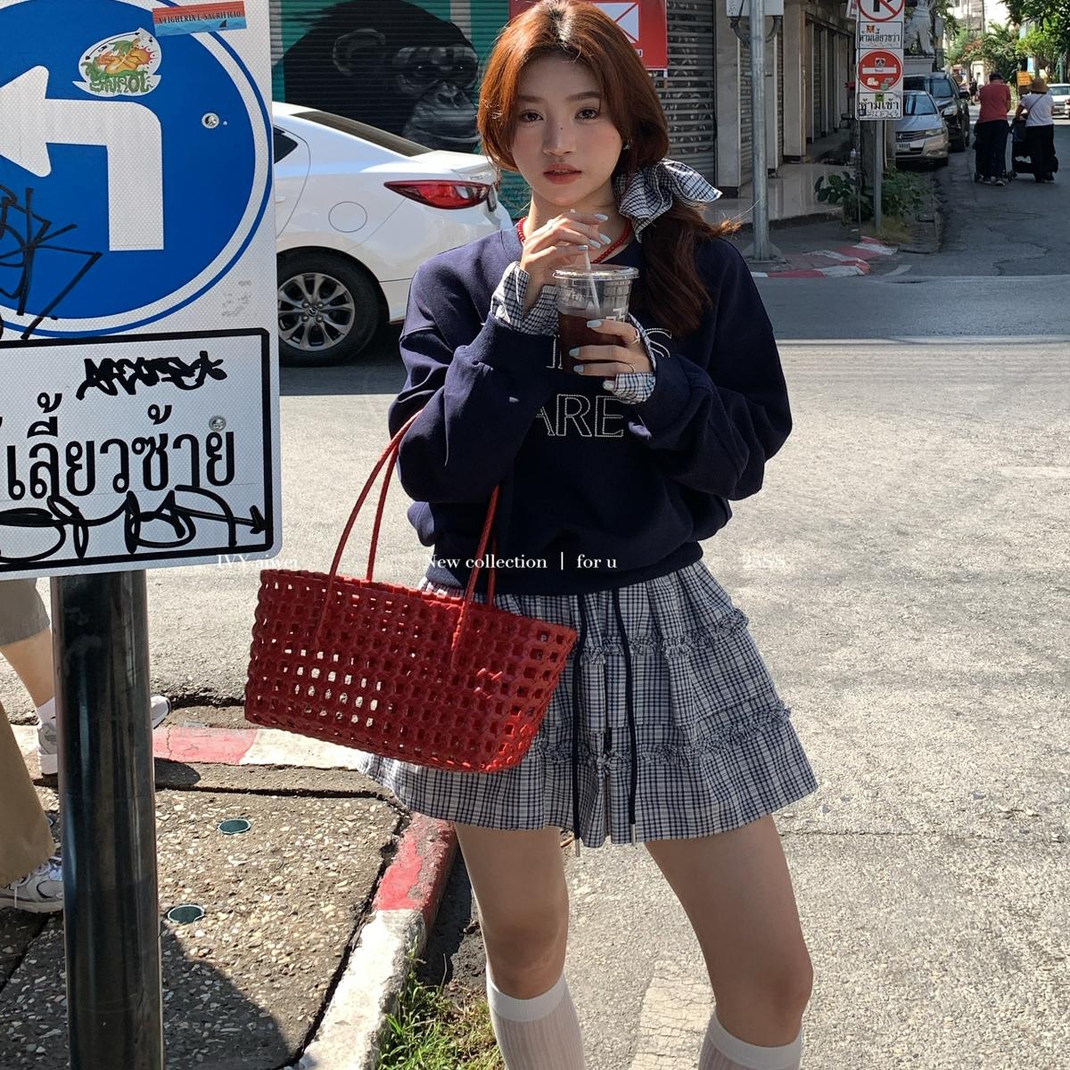 韩系慵懒风立体字母圆领套头卫衣女减龄高腰格子蛋糕半身裙套装春
