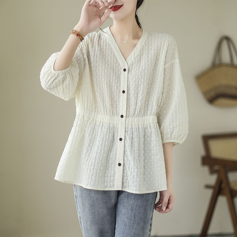 大码法式提花泡泡袖衬衫女夏款韩版遮肚显瘦娃娃衫V领宽松衬衣潮