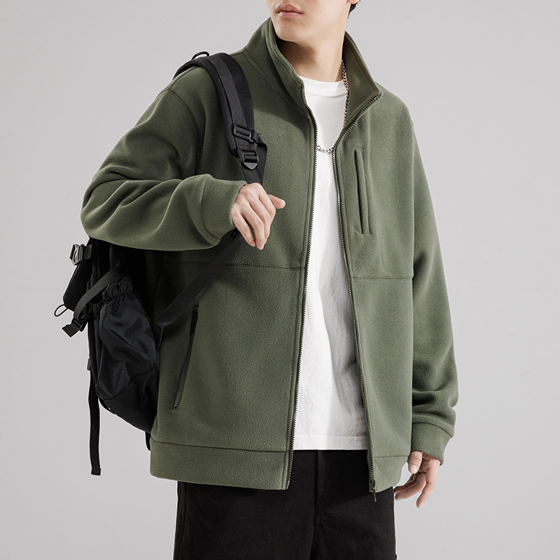 春秋季休闲百搭摇粒绒外套男士时尚重磅立领夹克加厚纯色开衫