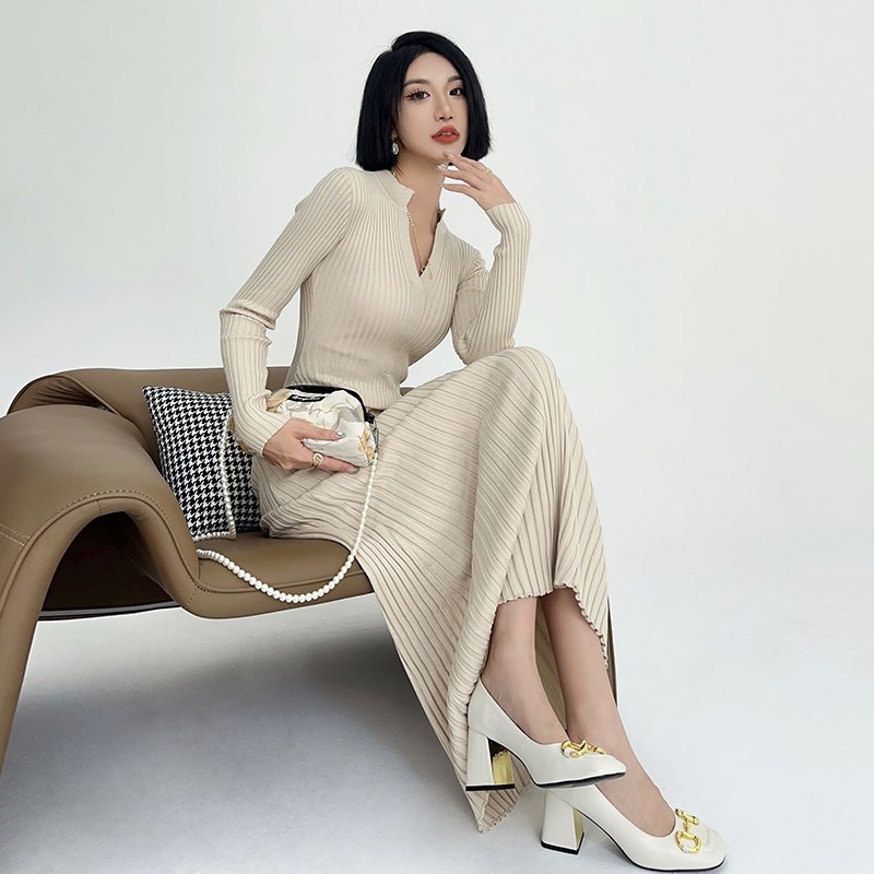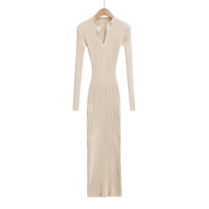 浅布调高个子春秋打底长裙V领修身高弹坑条针织直筒长袖连衣裙女