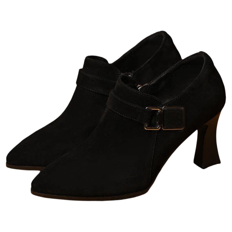 黑色尖头粗跟侧拉链真皮高跟鞋