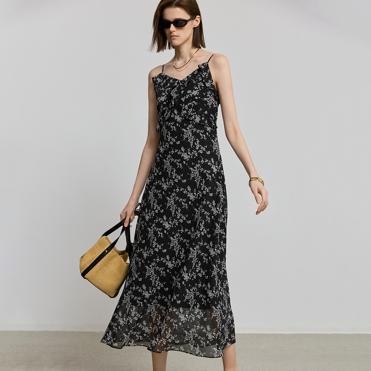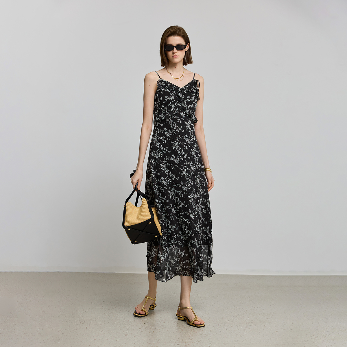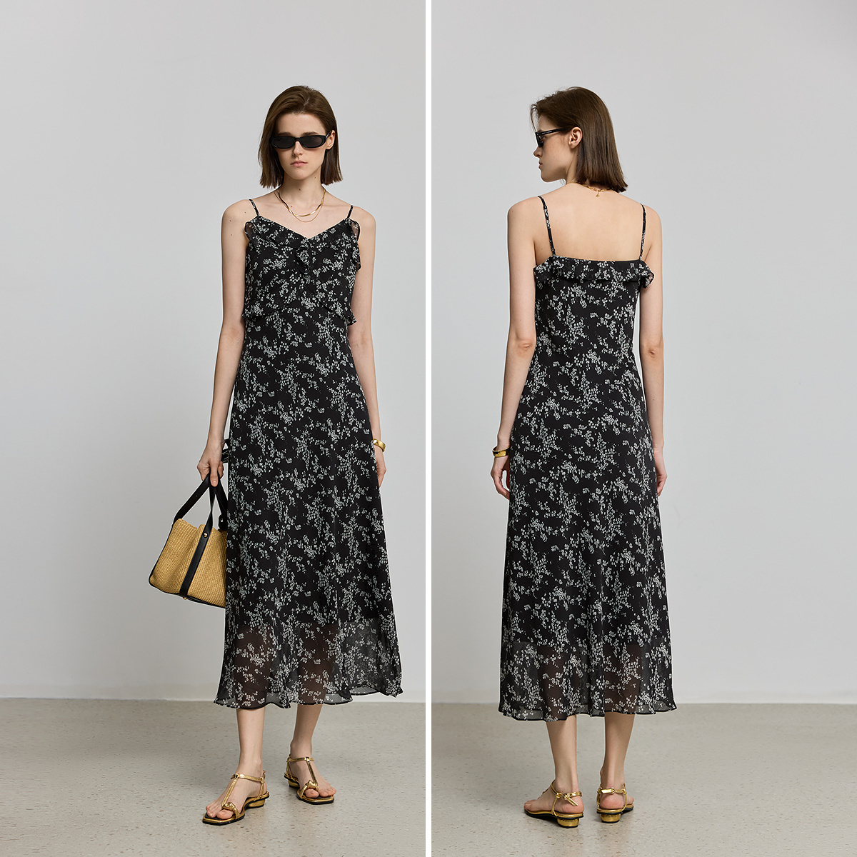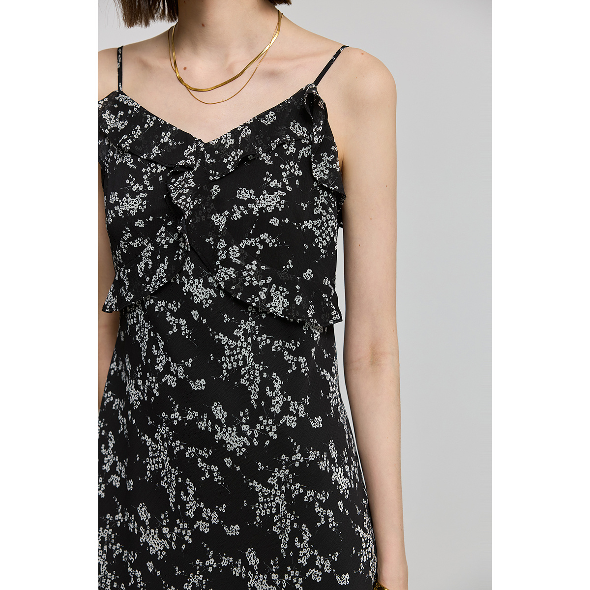 LILY2025新款女装复古黑白碎花V领荷叶边休闲收腰吊带裙连衣裙