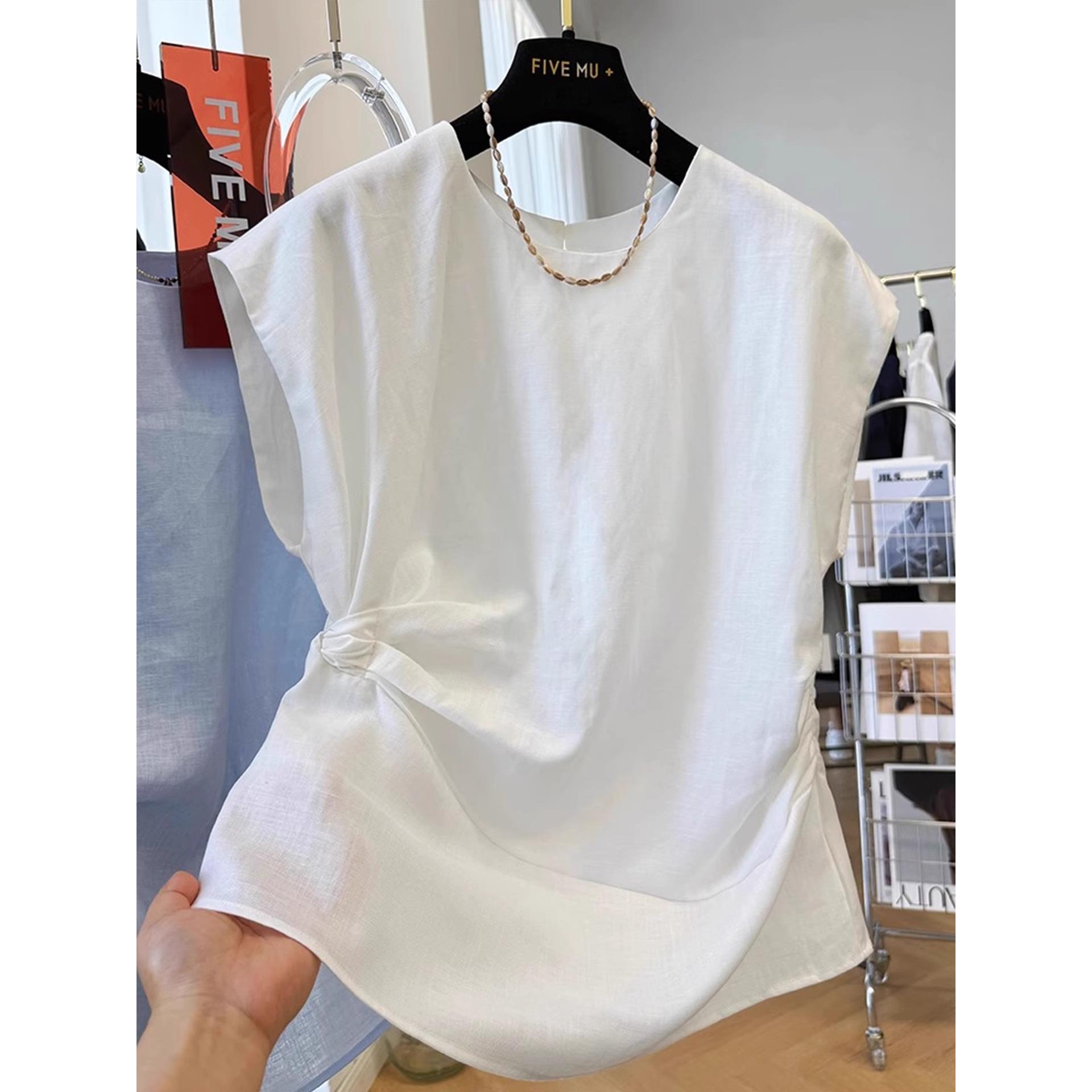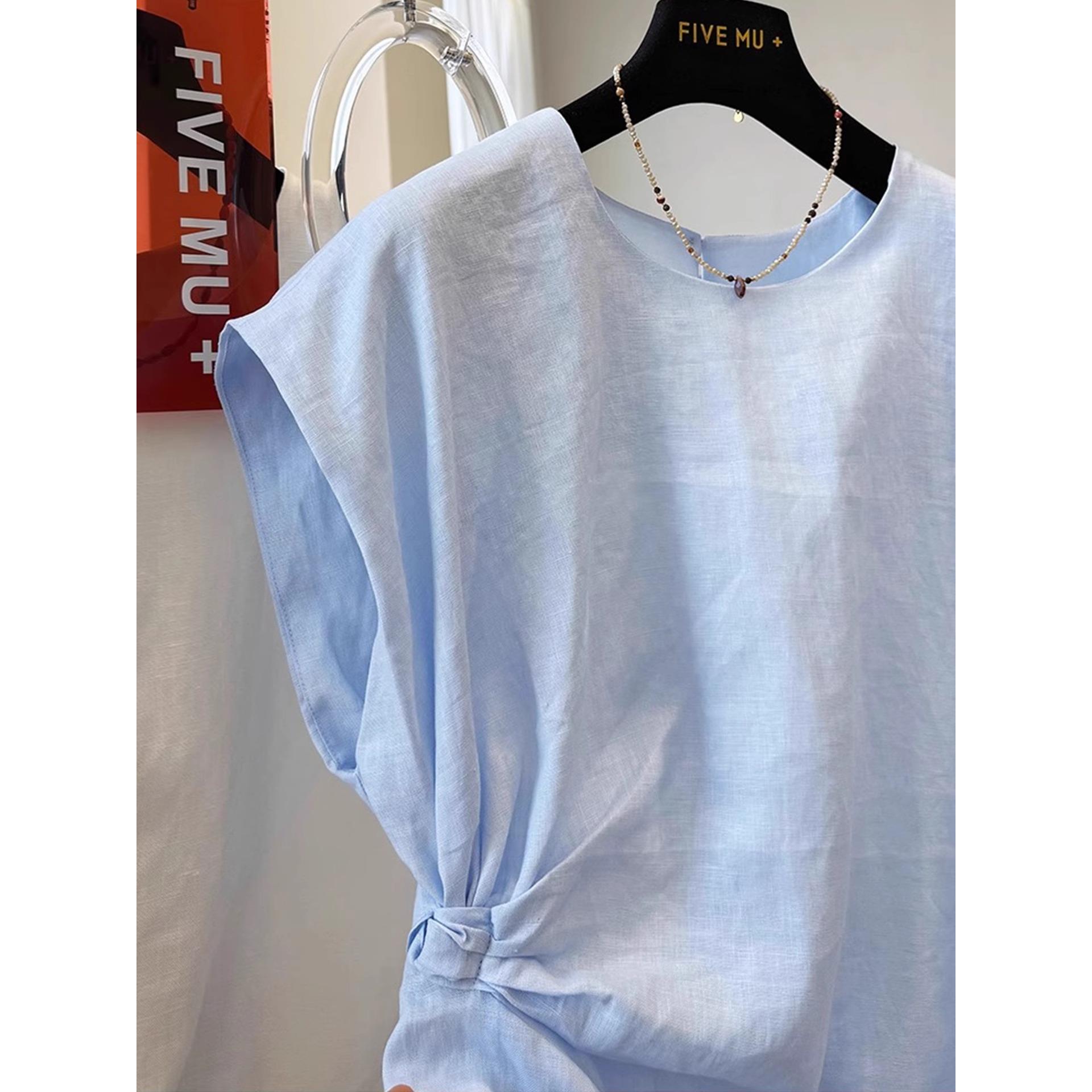 蓝色亚麻无袖衬衫女夏季大码胖mm设计感独特好看收腰显瘦小衫背心