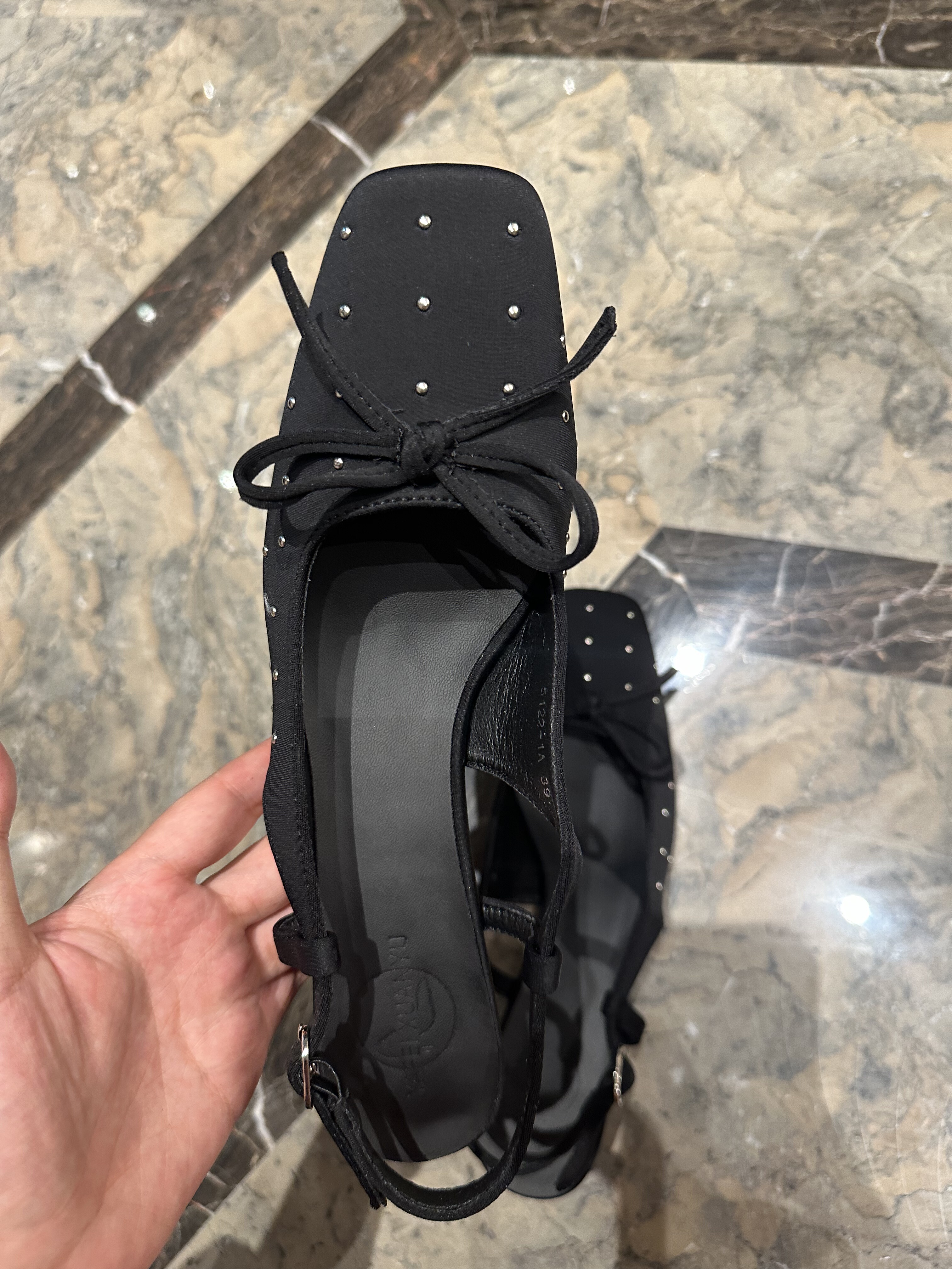 2025新款法式蝴蝶结缎面粗跟凉鞋女配裙子方头后空高跟鞋