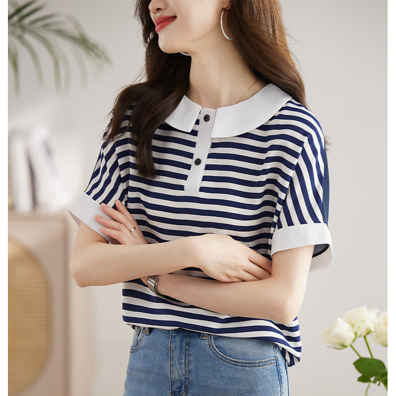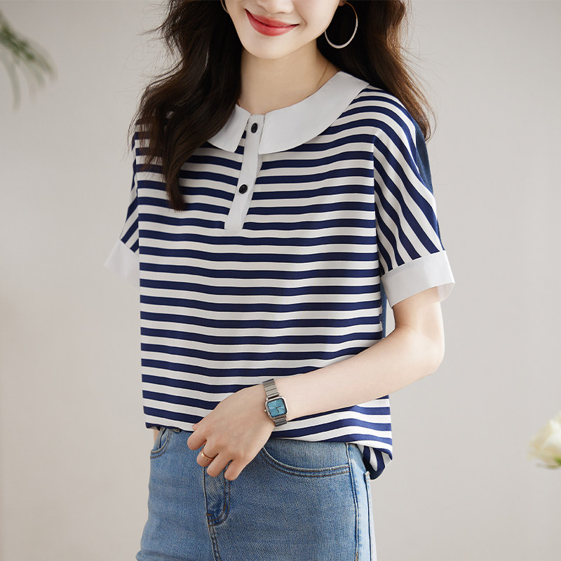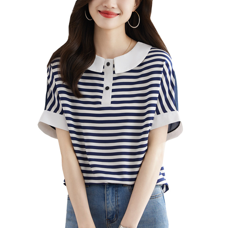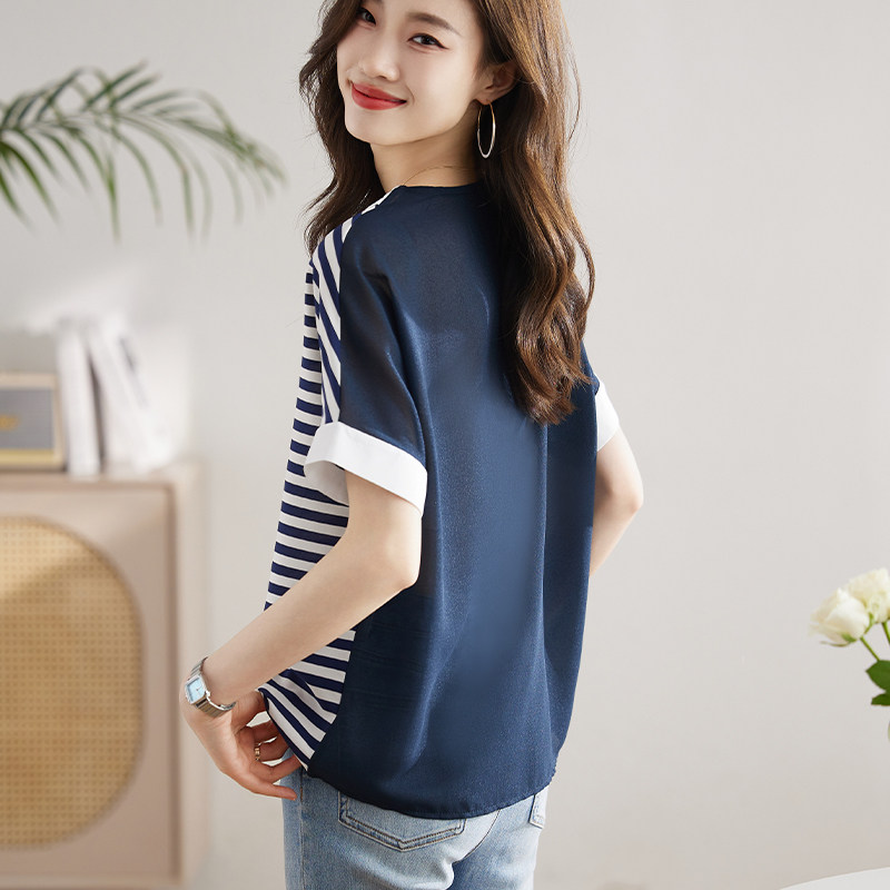 九月陌墨蝙蝠袖条纹拼接雪纺衫漂亮别致上衣2025夏季圆领短袖女薄