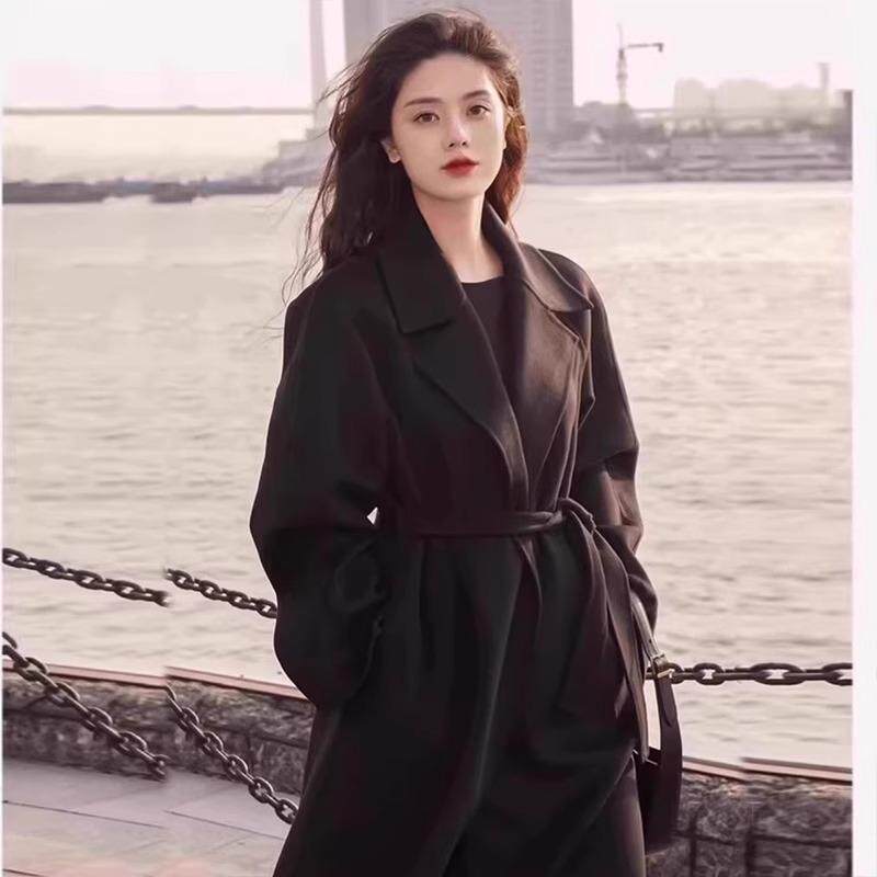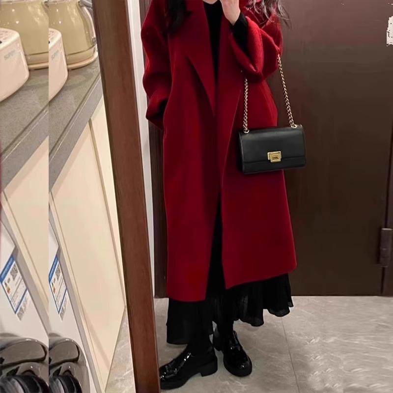 酒红色双面羊毛大衣女新年跨年新娘敬酒服高级感中长款毛呢外套女