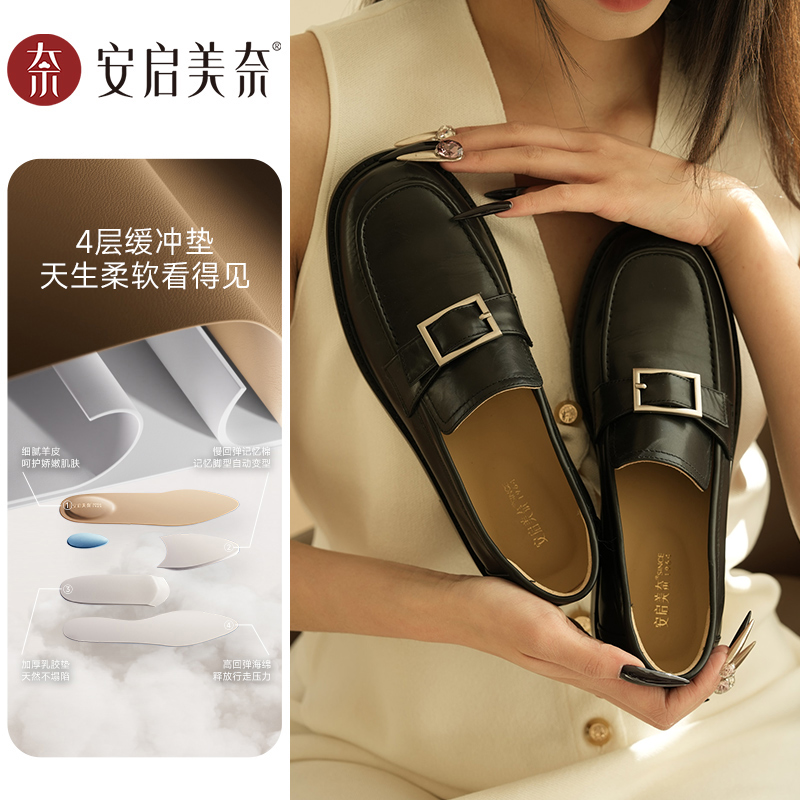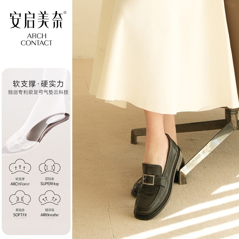 安启美奈足弓气垫云新款乐福鞋春秋百搭休闲女鞋黑色胎牛皮小皮鞋