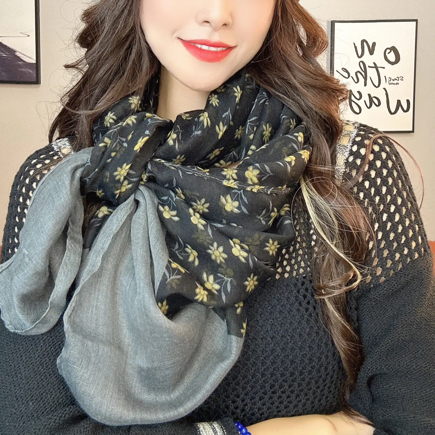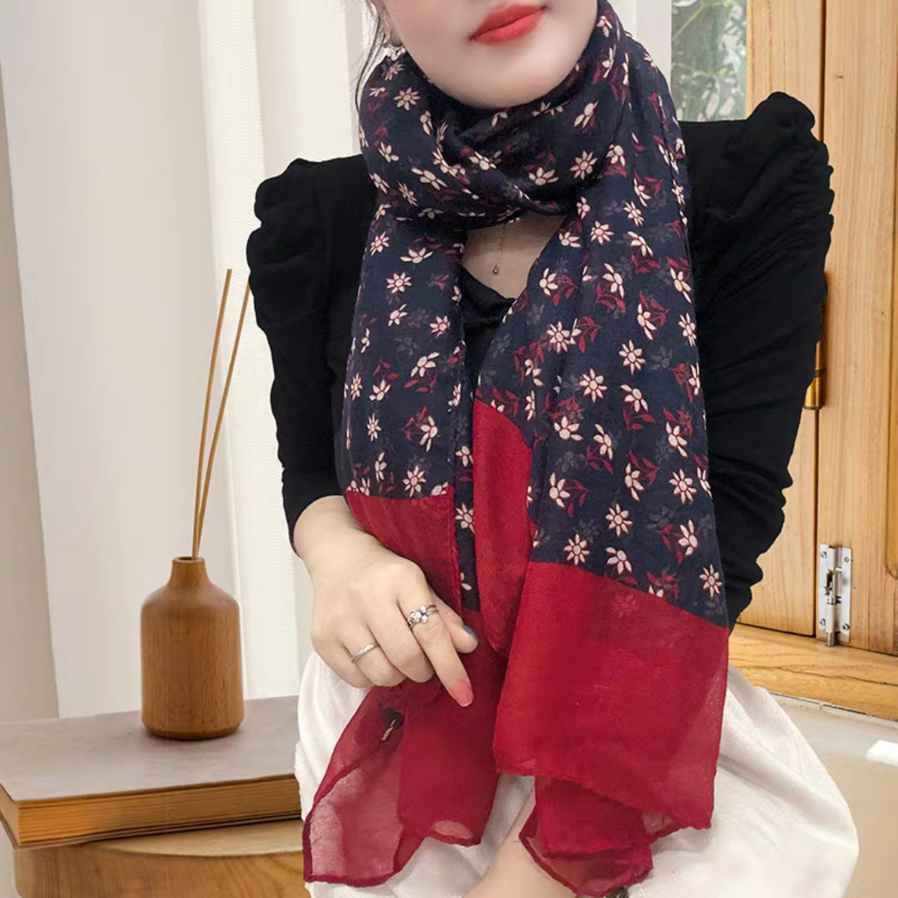 新款时尚百搭丝巾气质优雅棉麻碎花双色围巾秋冬季披肩两用围脖女