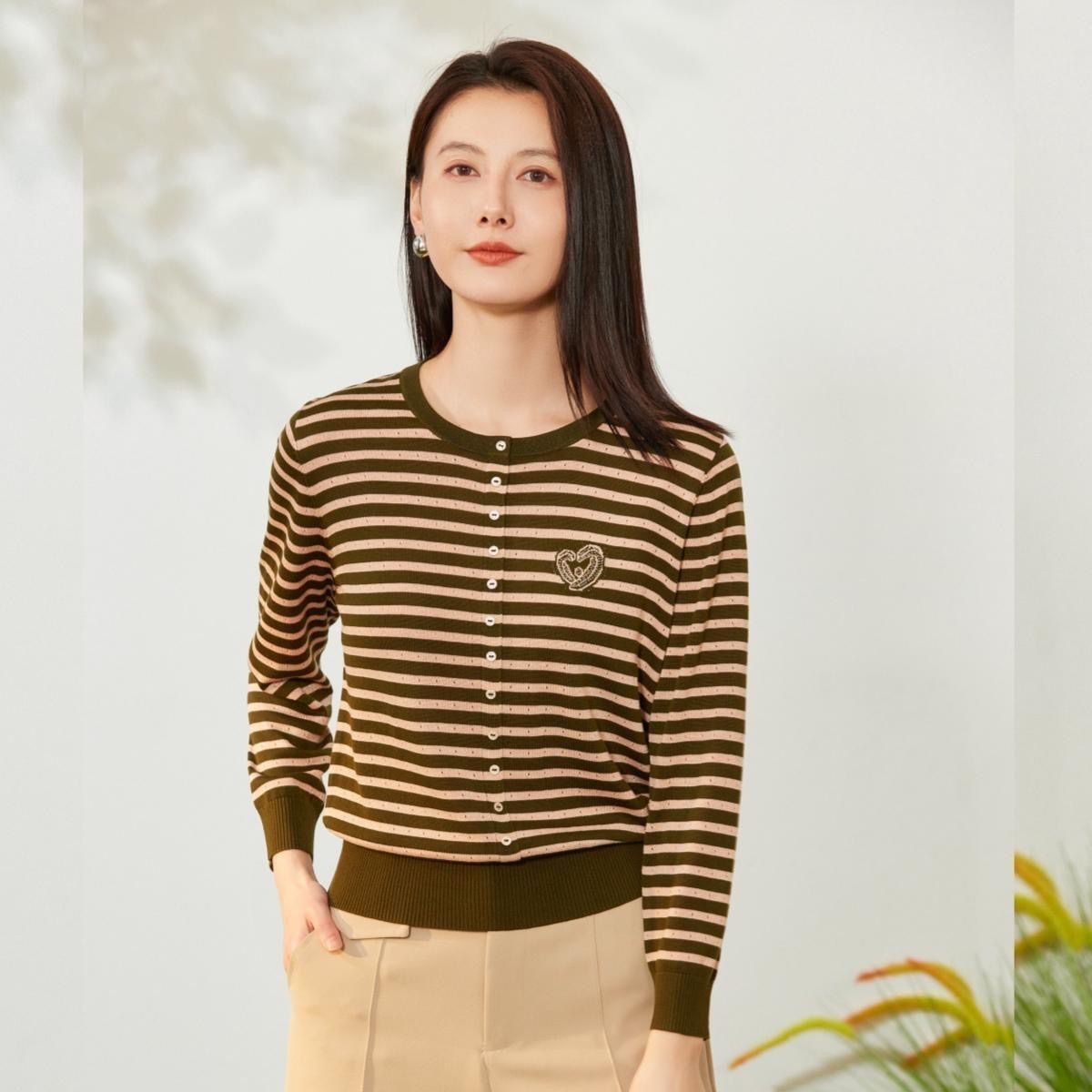 百搭妈妈打底春秋2025时尚长袖新款宽松圆领条纹上衣针织衫毛衣