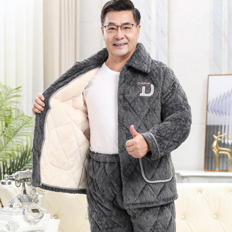 男士睡衣男秋冬季加厚加绒珊瑚绒夹棉袄中老年保暖爸爸家居服冬款