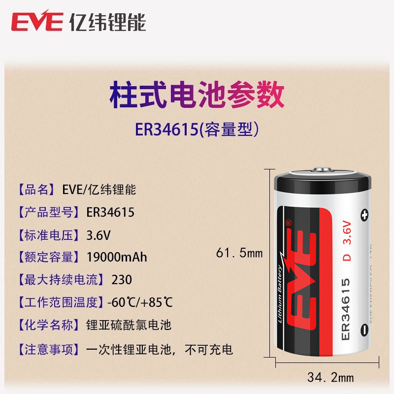 EVE/亿纬ER34615 3.6V锂电池 D型1号物联网 燃气表涡流流量计仪表