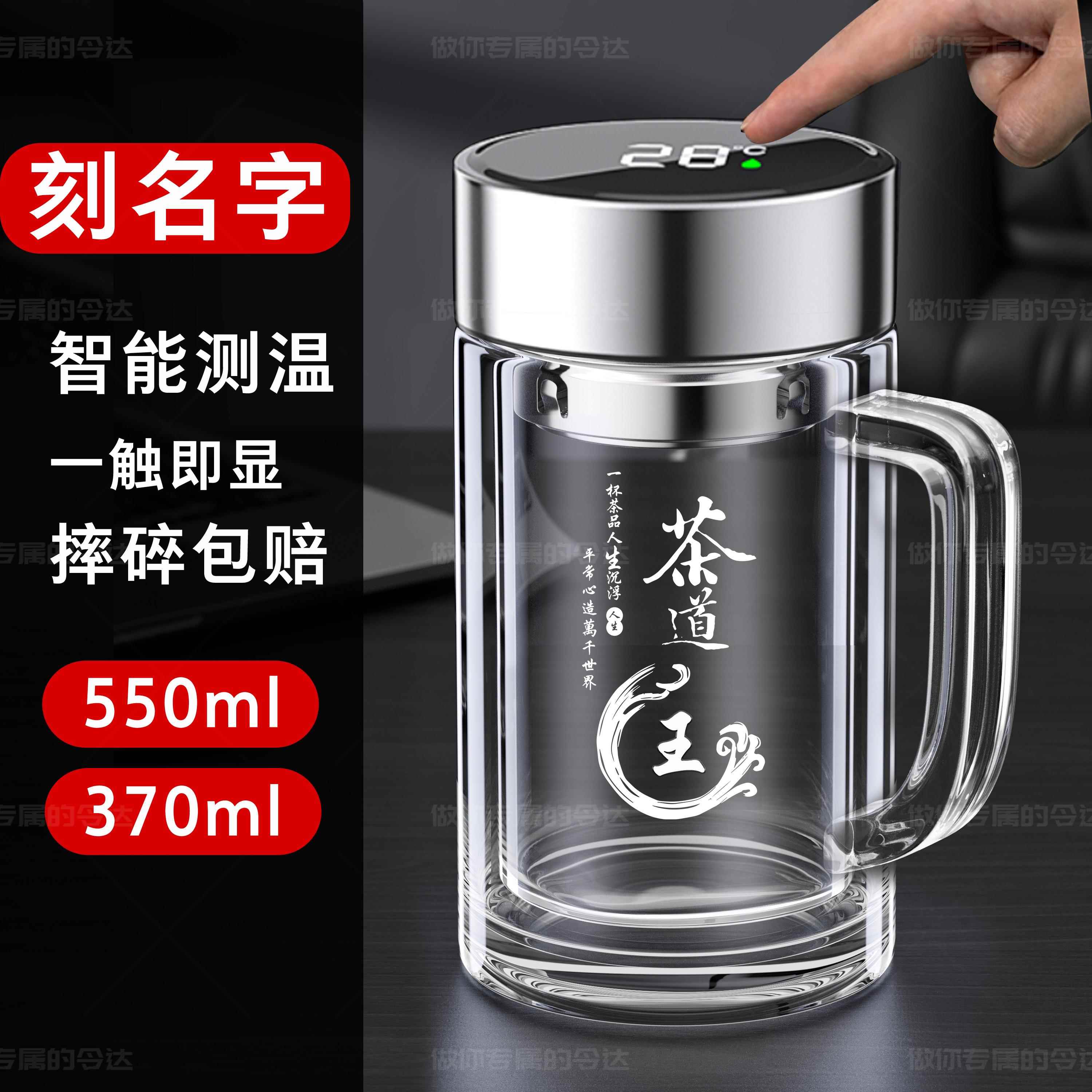 智能显温把手双层加厚男士茶杯商务办公手柄泡茶玻璃水杯定制姓名